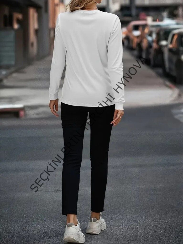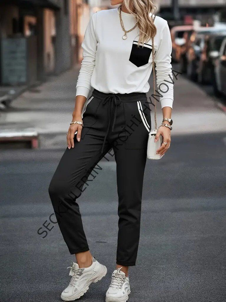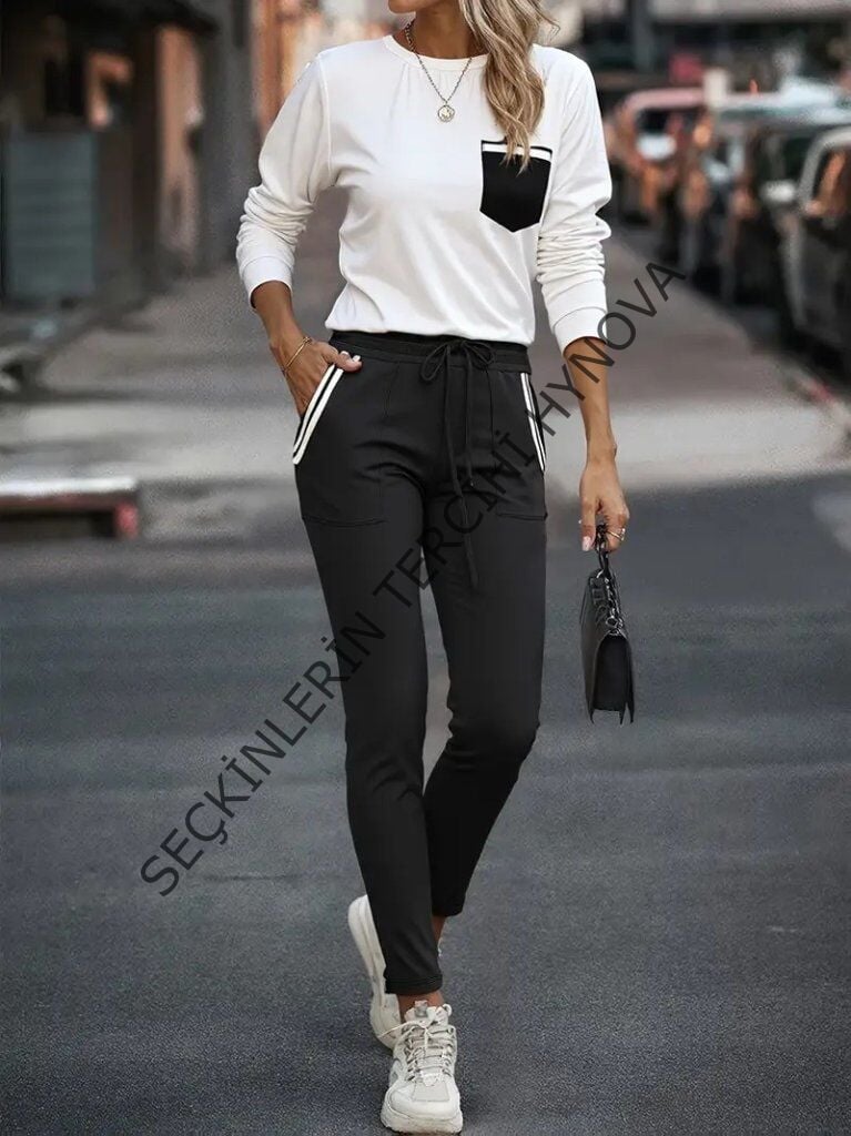 Kadın Uzun Kollu Bisiklet Yaka Cepli Viskon Iki Iplik Bluz Ve Pantolon Ikili Takım