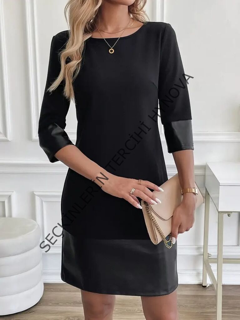 Kadın Uzun Kollu Bisiklet Yaka Deri Detaylı Ithal Krep Elbise
