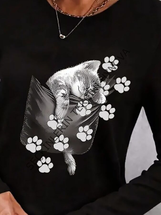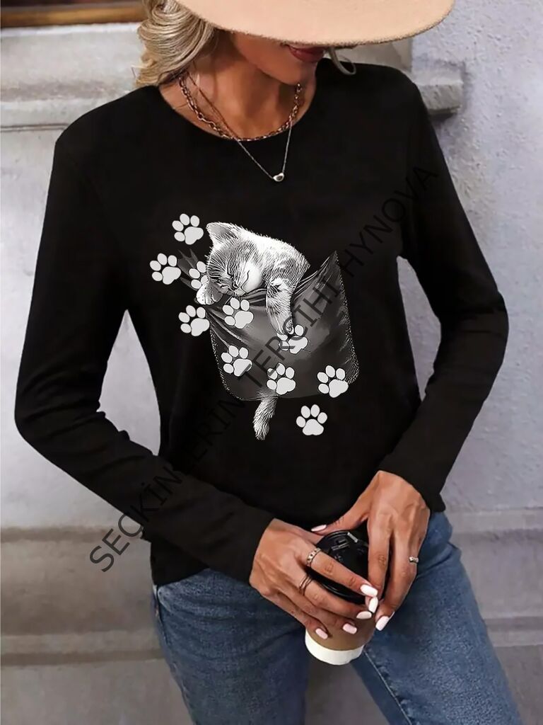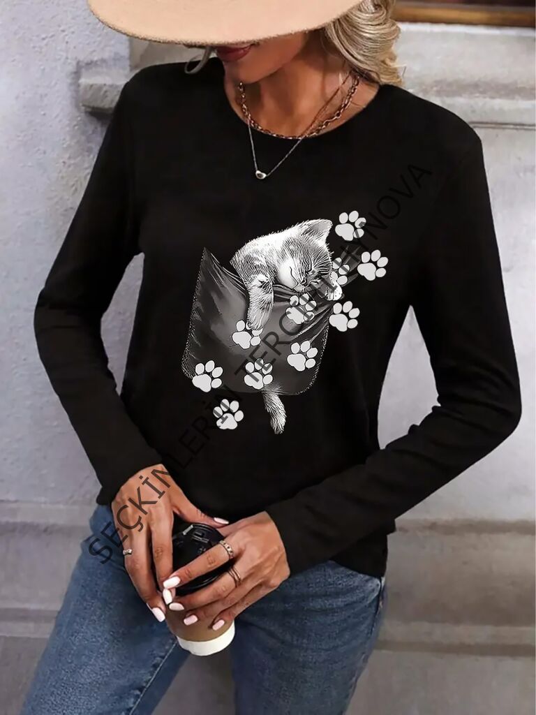 Kadın Uzun Kollu Bisiklet Yaka Desenli Viskon Bluz