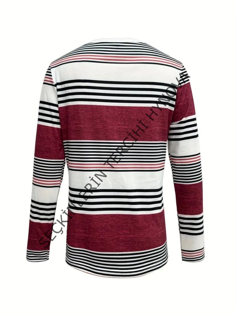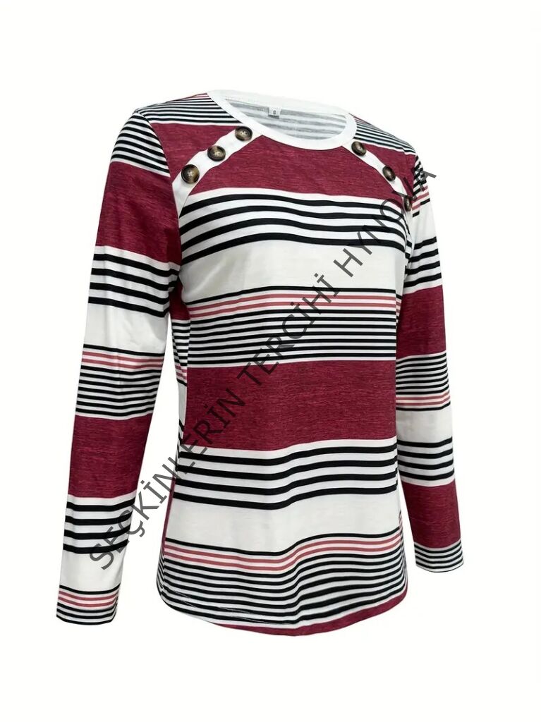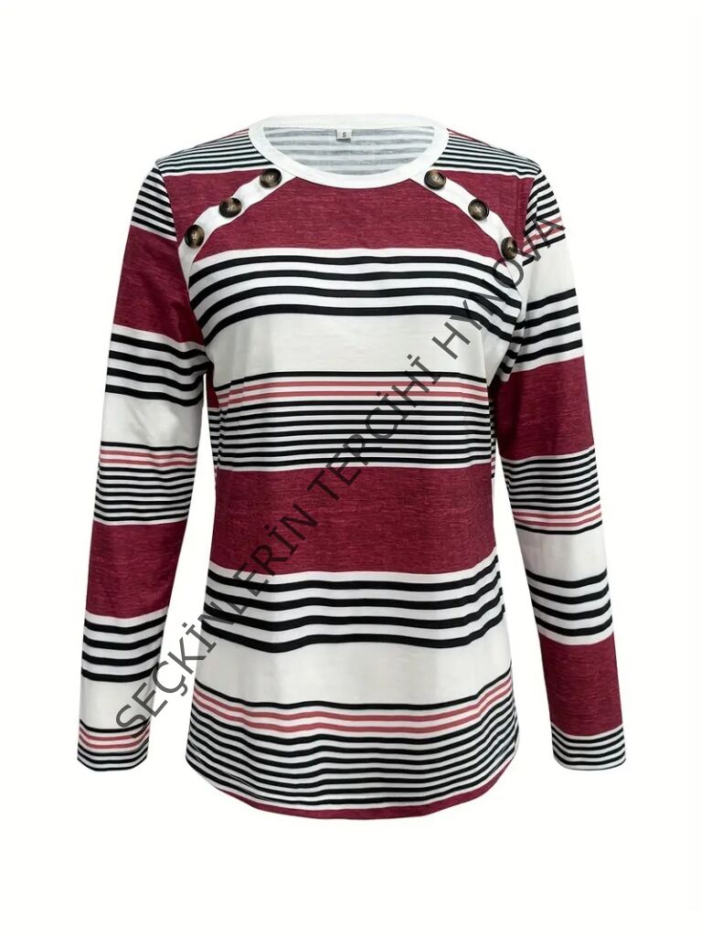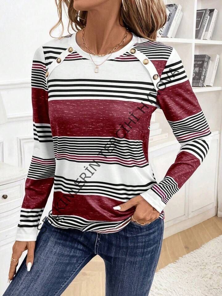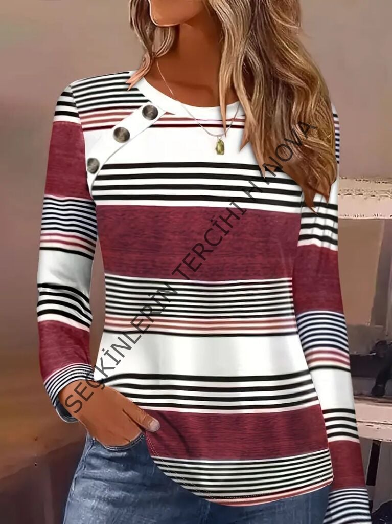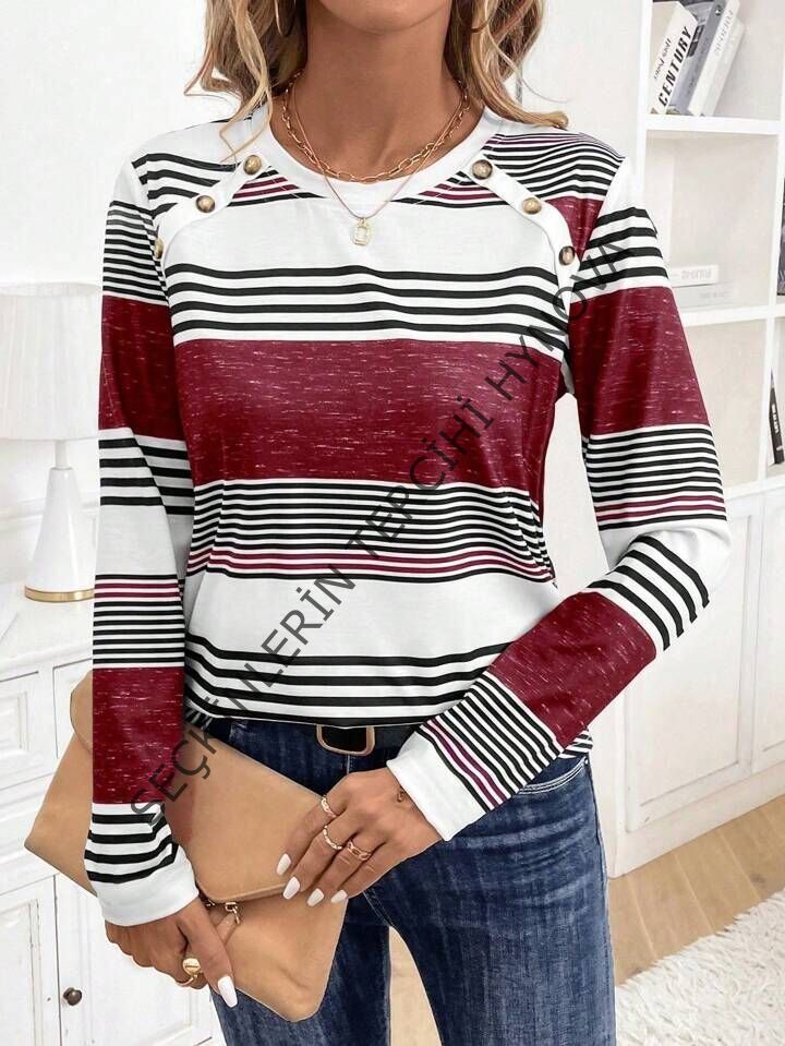 Kadın Uzun Kollu Bisiklet Yaka Düğme Detaylı Desenli Süprem Bluz