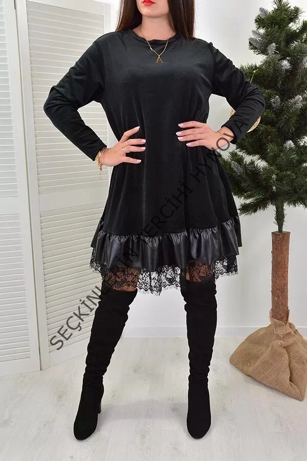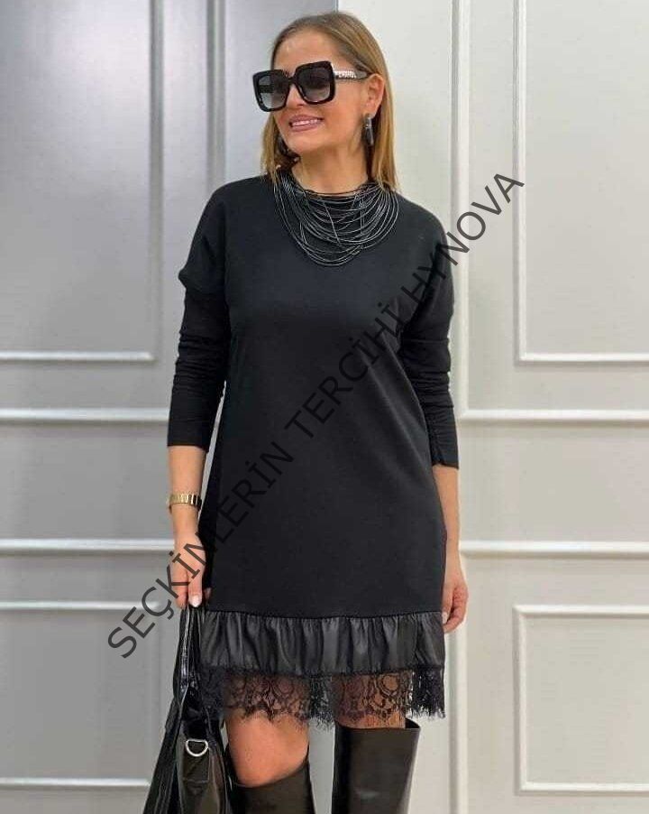 Kadın Uzun Kollu Bisiklet Yaka Etek Ucu Deri Ve Tül Detay Iki Iplik Mini Boy Elbise