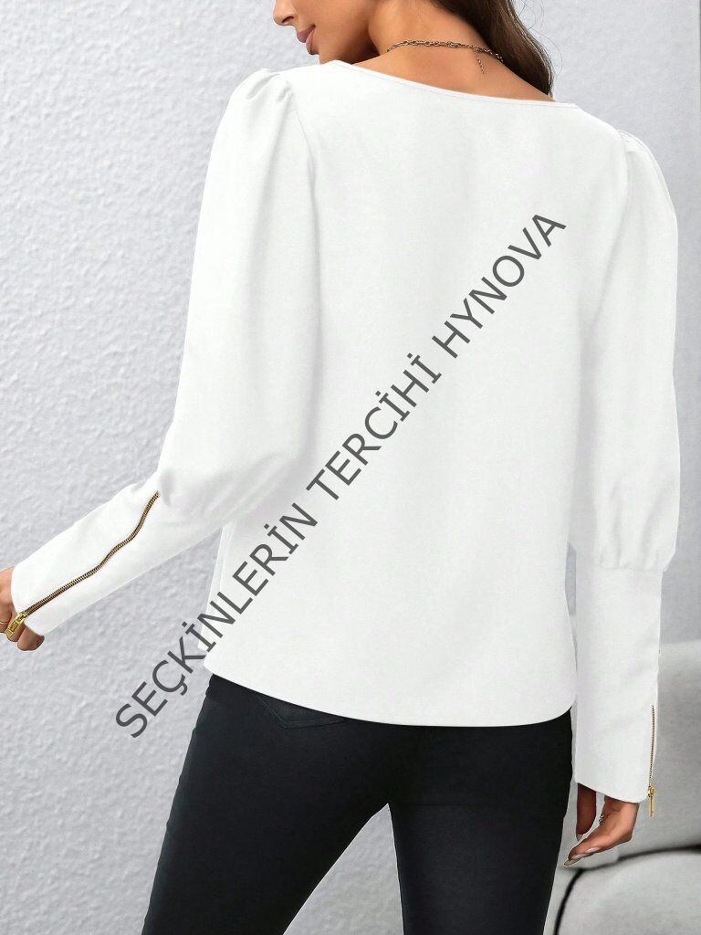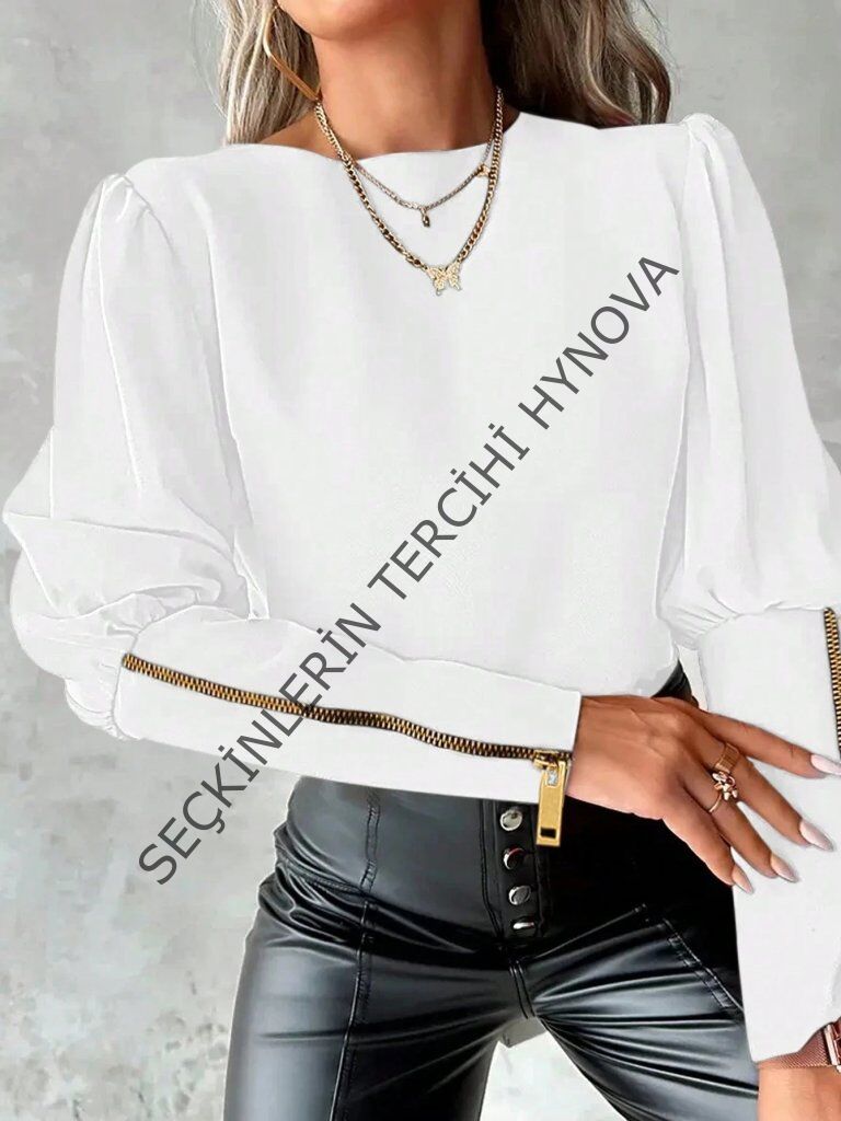 Kadın Uzun Kollu Bisiklet Yaka Fermuar Detaylı Ithal Krep Bluz