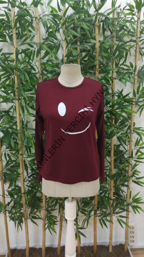 Kadın Uzun Kollu Bisiklet Yaka Gülen Yüz Desenli Viskon Bluz