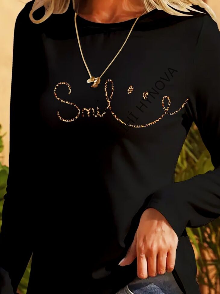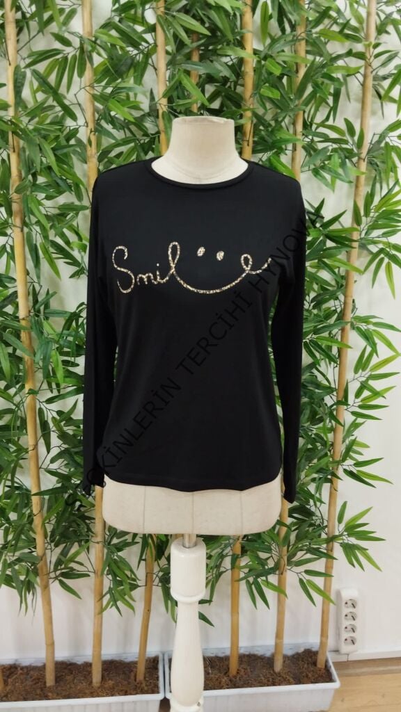 Kadın Uzun Kollu Bisiklet Yaka Gülümseyen Surat Desenli Viskon Bluz