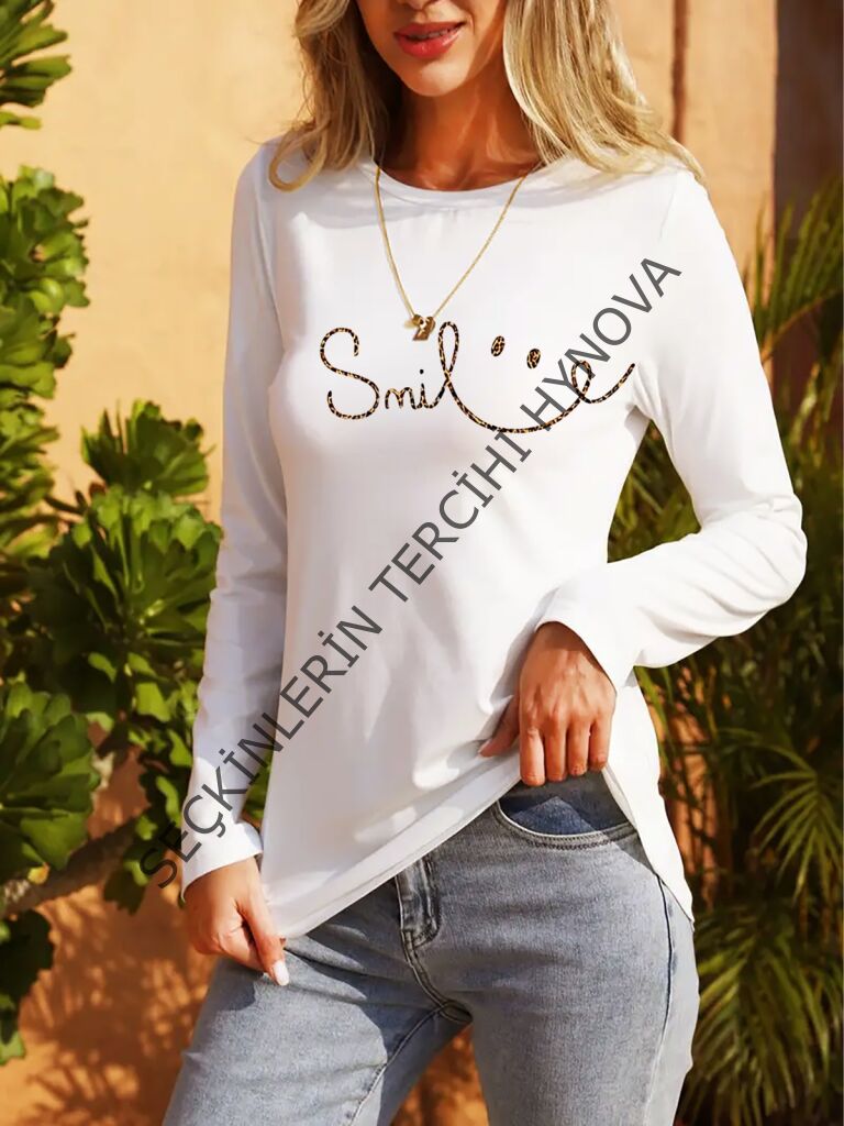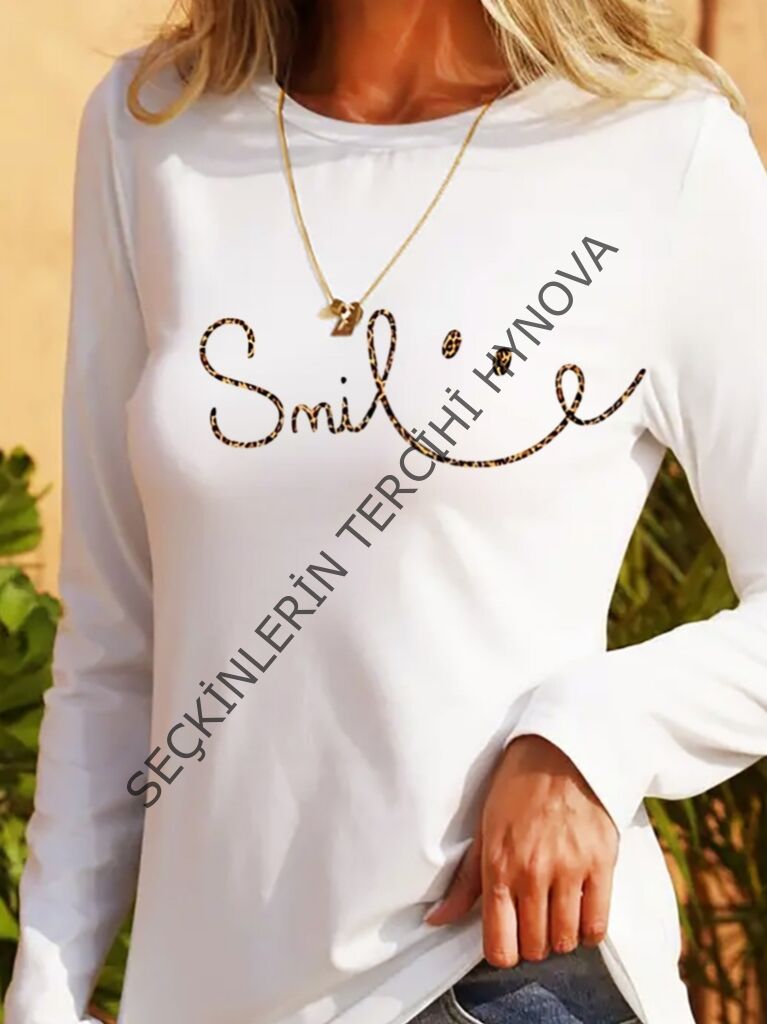 Kadın Uzun Kollu Bisiklet Yaka Gülümseyen Surat Desenli Viskon Bluz