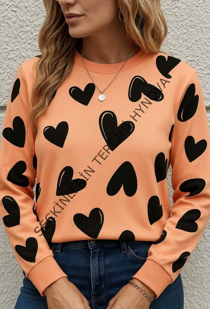 Kadın Uzun Kollu Bisiklet Yaka Kalp Desenli Iki Iplik Bluz