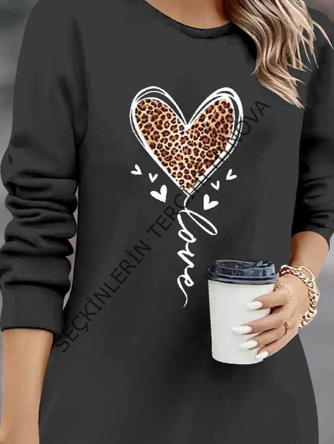 Kadın Uzun Kollu Bisiklet Yaka Kalp Desenli Kısa Viskon Elbise
