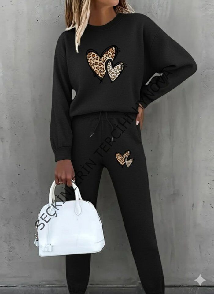 Kadın Uzun Kollu Bisiklet Yaka Kalp Desenli şardonlu üç Iplik Bluz Ve Pantolon Ikili Takım