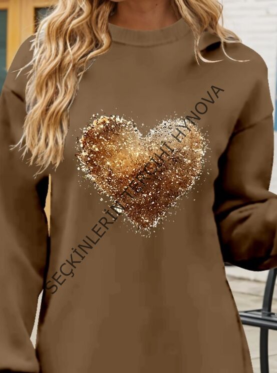 Kadın Uzun Kollu Bisiklet Yaka Kalp Desenli Viskon Iki Iplik Bluz