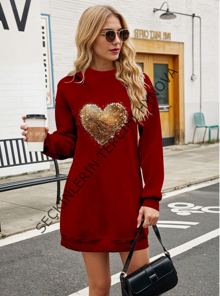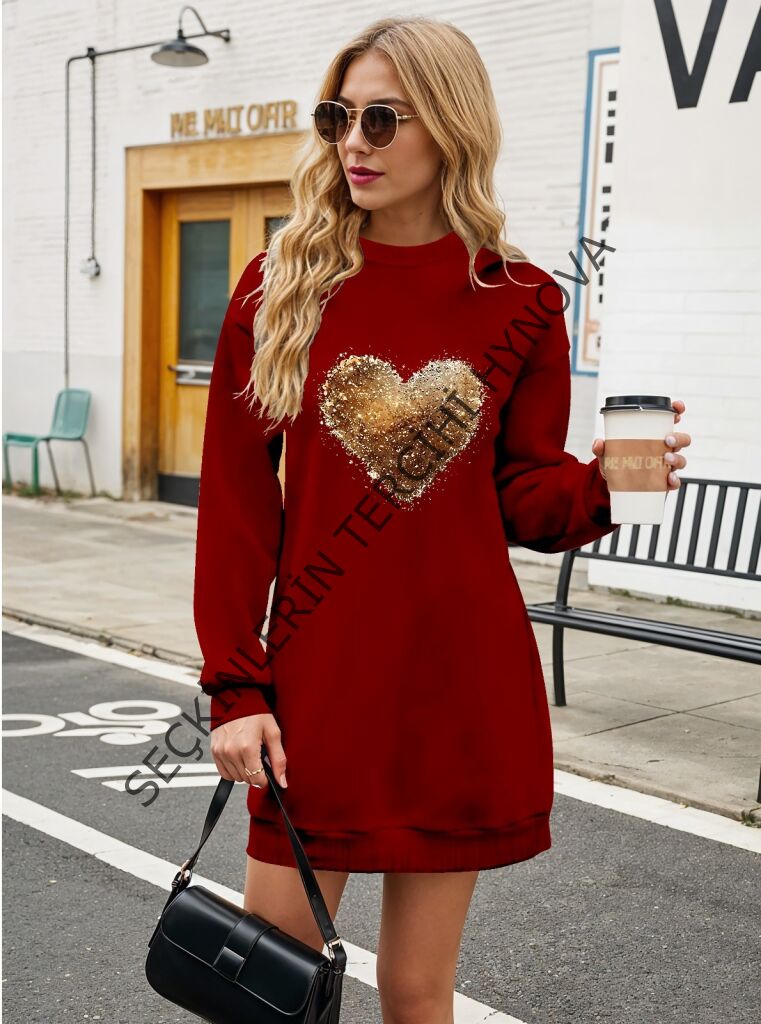 Kadın Uzun Kollu Bisiklet Yaka Kalp Desenli Viskon Iki Iplik Bluz