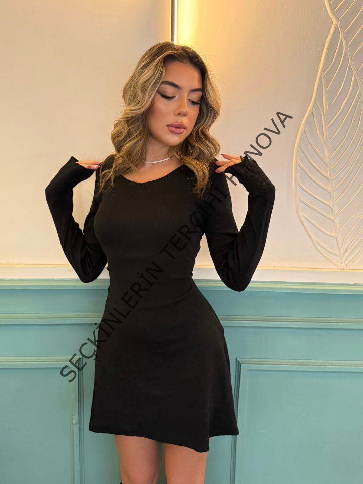 Kadın Uzun Kollu Bisiklet Yaka Kısa Kaşkorse Elbise