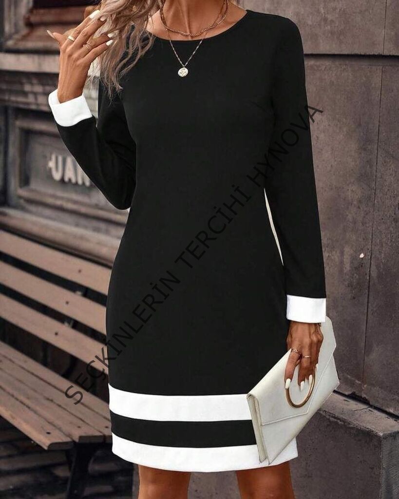 Kadın Uzun Kollu Bisiklet Yaka Kol Ve Tek Ucu şeritli Ithal Krep Midi Elbise