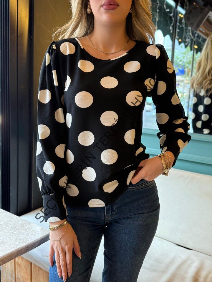 Kadın Uzun Kollu Bisiklet Yaka Kollar Geniş Kol Ağzı Manşetli Iki Düğmeli Detay Krep Bluz