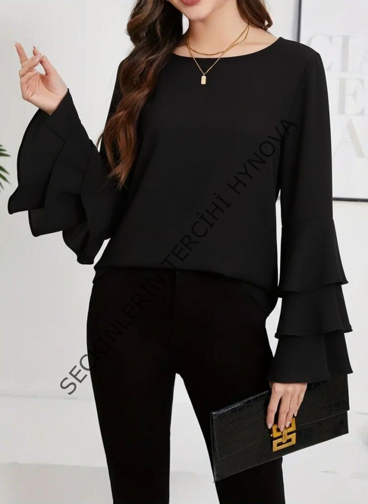 Kadın Uzun Kollu Bisiklet Yaka Kollar İspanyol Volanlı Sandy Bluz