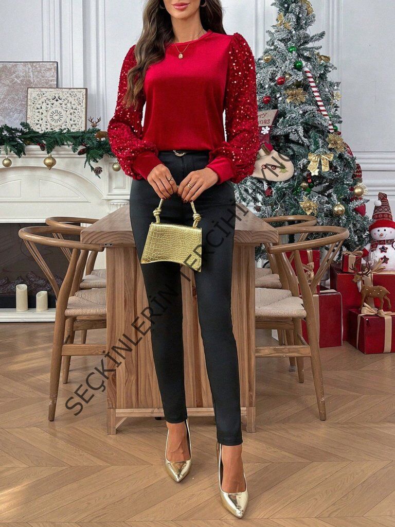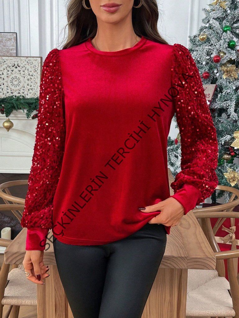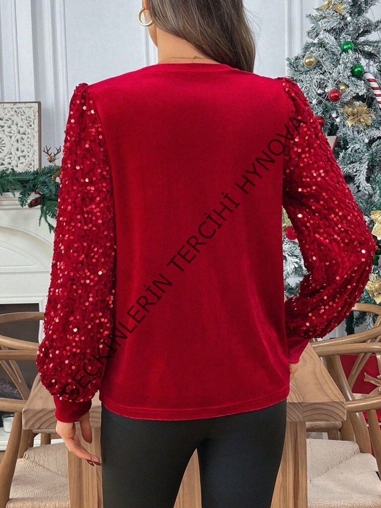 Kadın Uzun Kollu Bisiklet Yaka Kollar Pulpayet Kadife Bluz