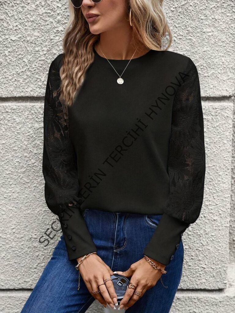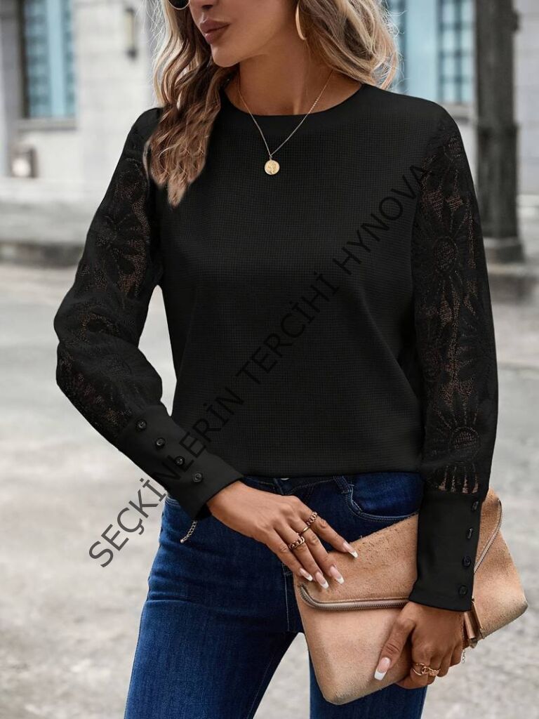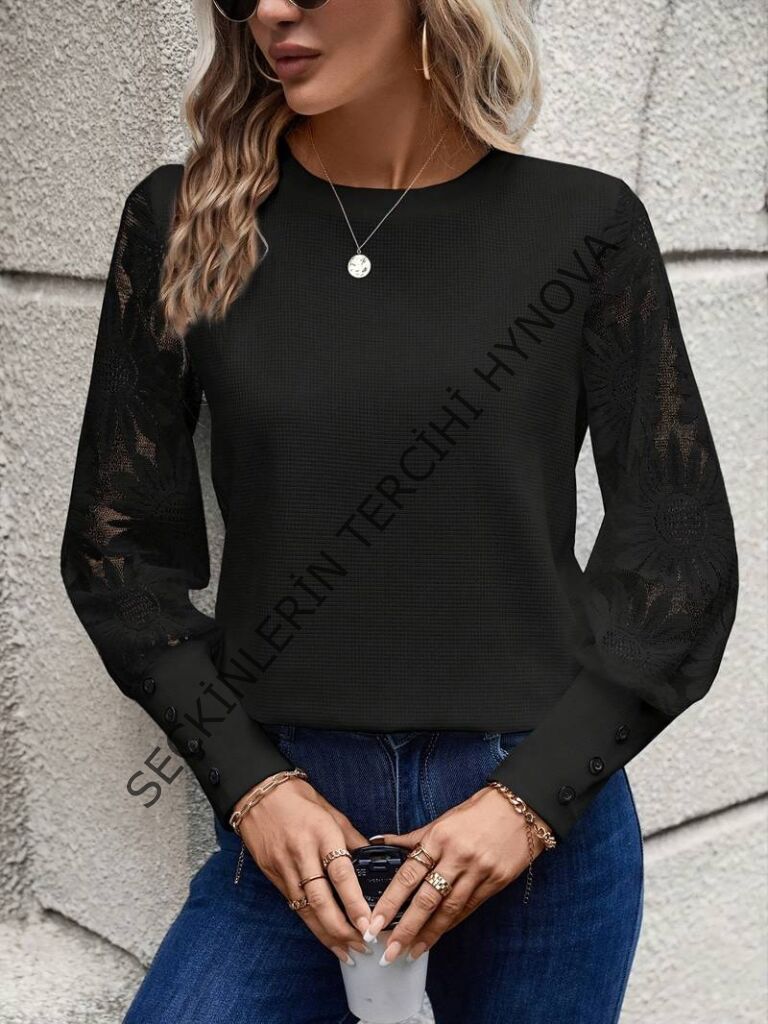 Kadın Uzun Kollu Bisiklet Yaka Kolları çiçekli Waffle Bluz