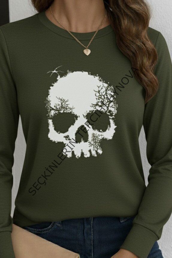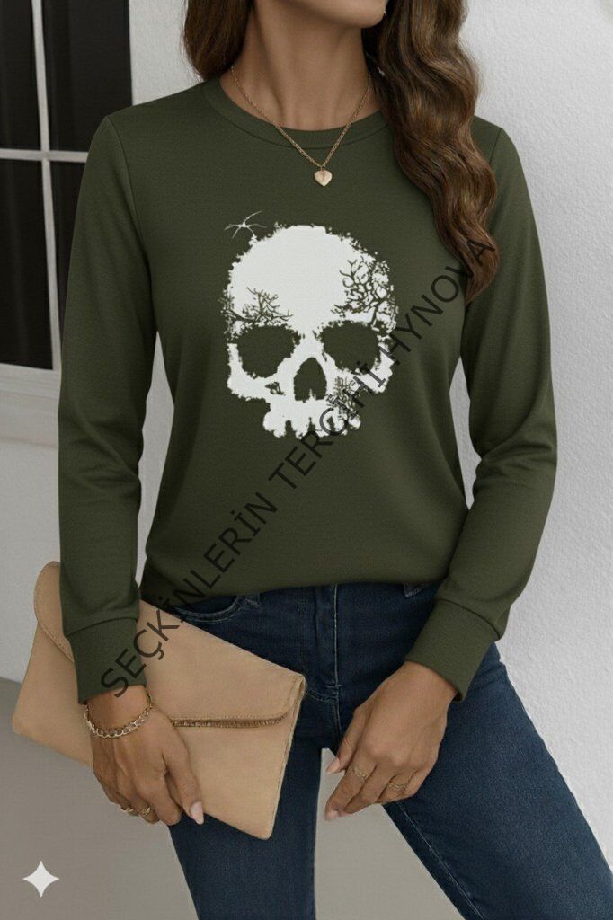 Kadın Uzun Kollu Bisiklet Yaka Kurukafa Desenli Viskon Bluz