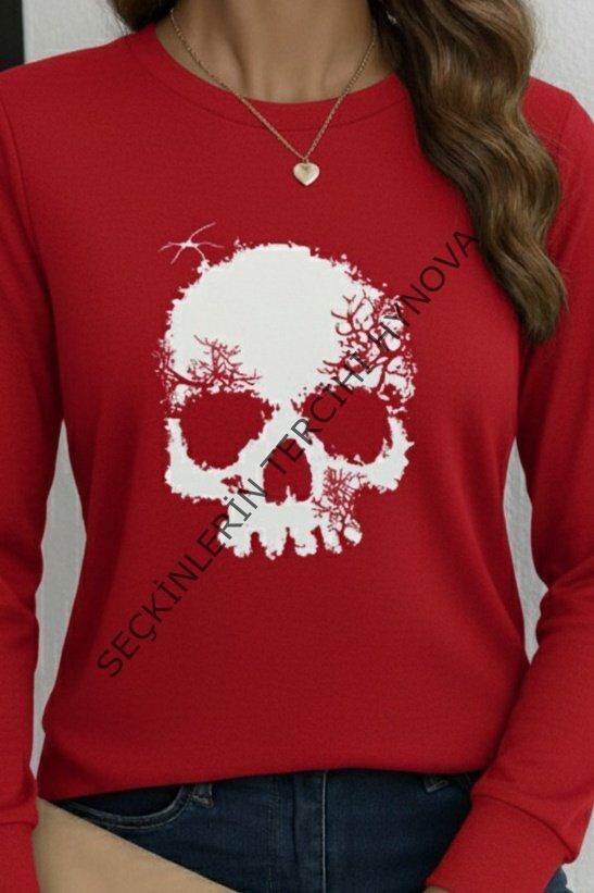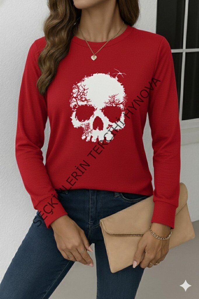 Kadın Uzun Kollu Bisiklet Yaka Kurukafa Desenli Viskon Bluz