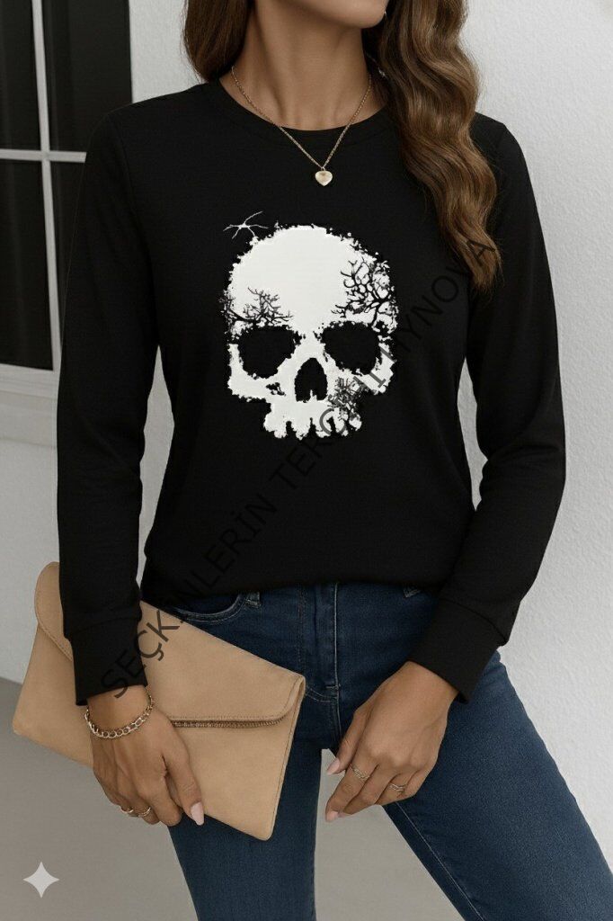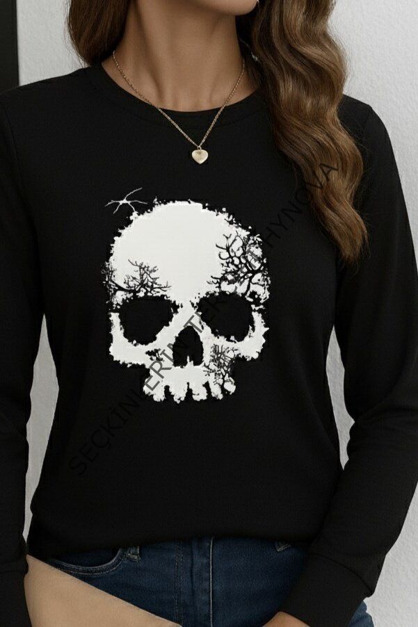 Kadın Uzun Kollu Bisiklet Yaka Kurukafa Desenli Viskon Bluz