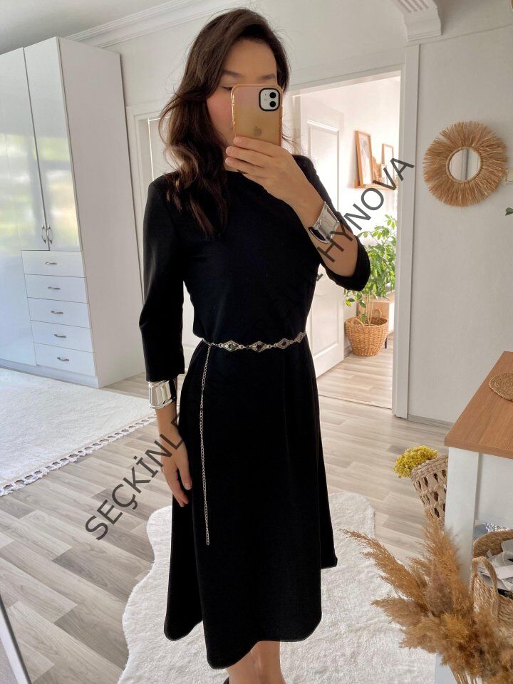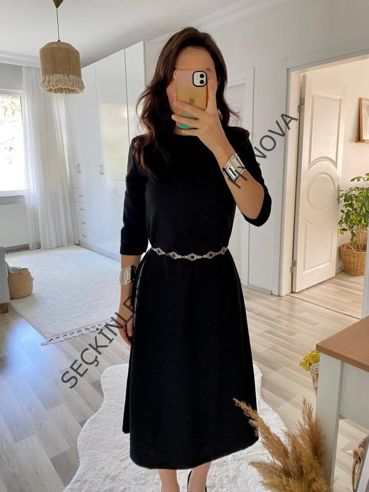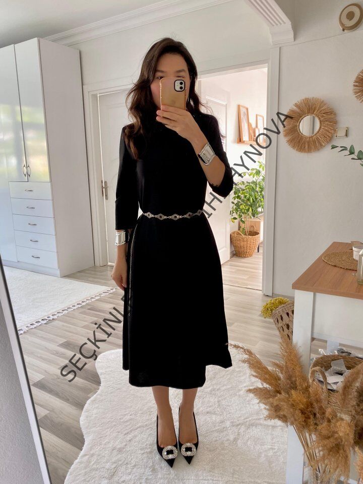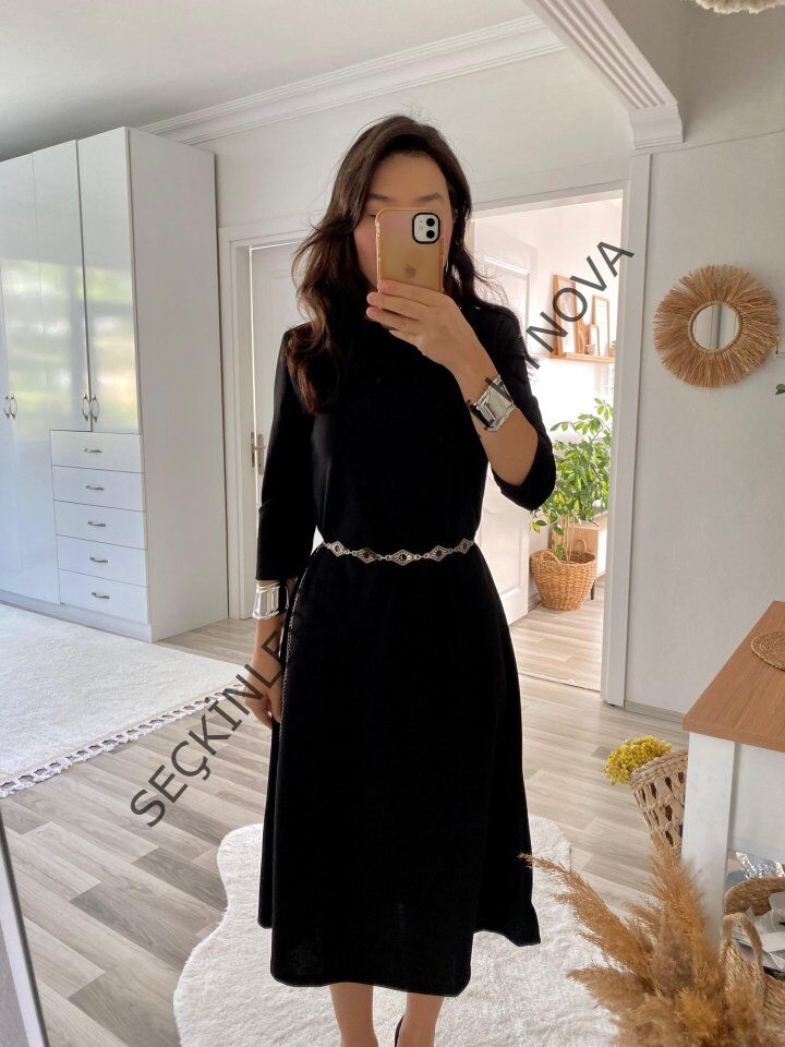 Kadın Uzun Kollu Bisiklet Yaka Midi Ithal Krep Elbise