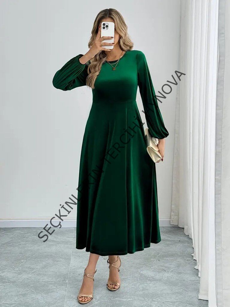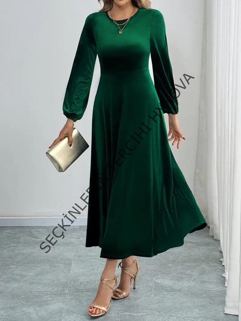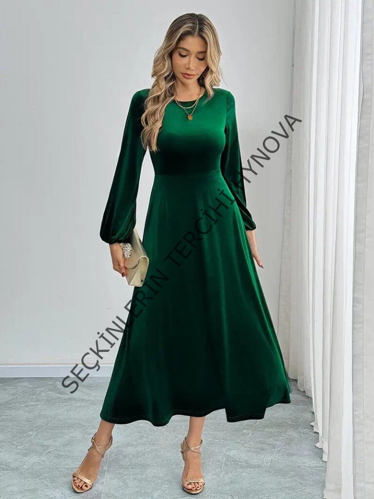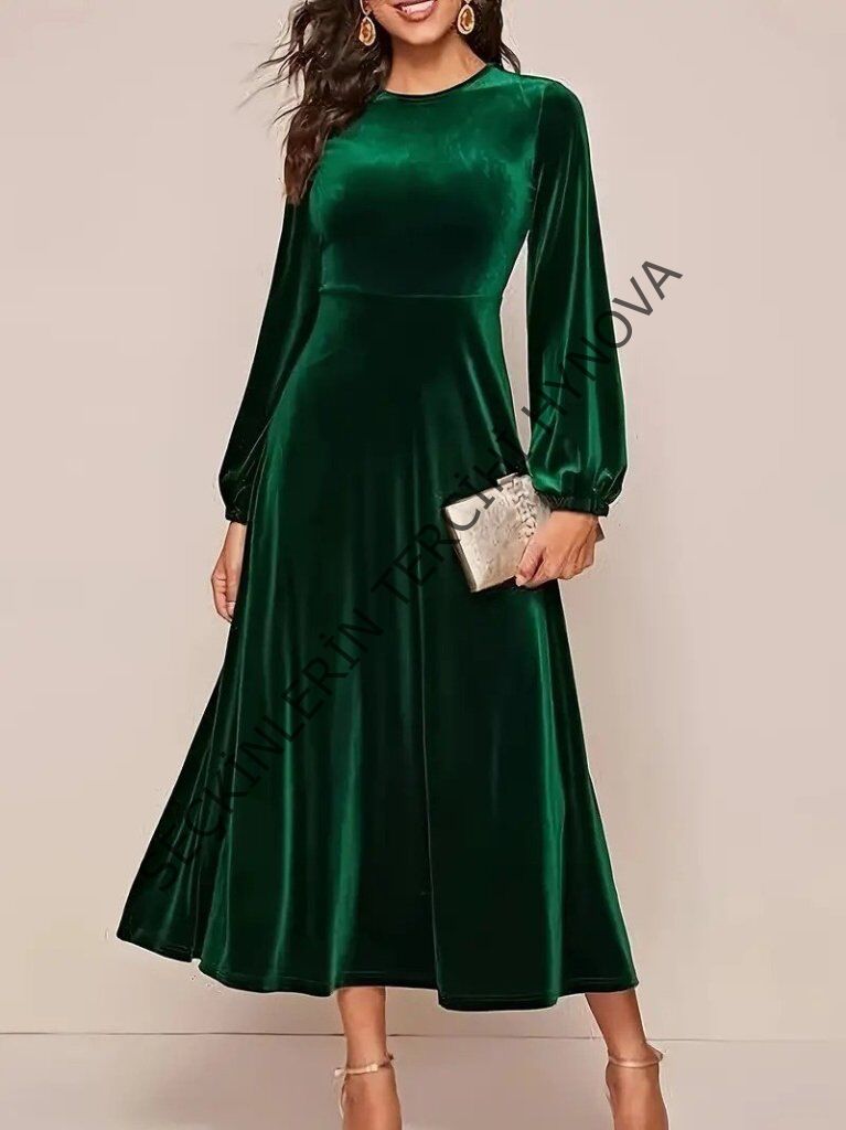 Kadın Uzun Kollu Bisiklet Yaka Midi Kadife Elbise