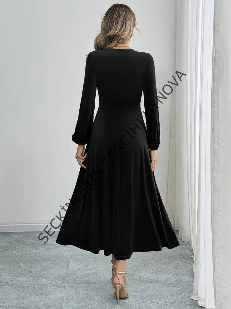 Kadın Uzun Kollu Bisiklet Yaka Midi Kadife Elbise