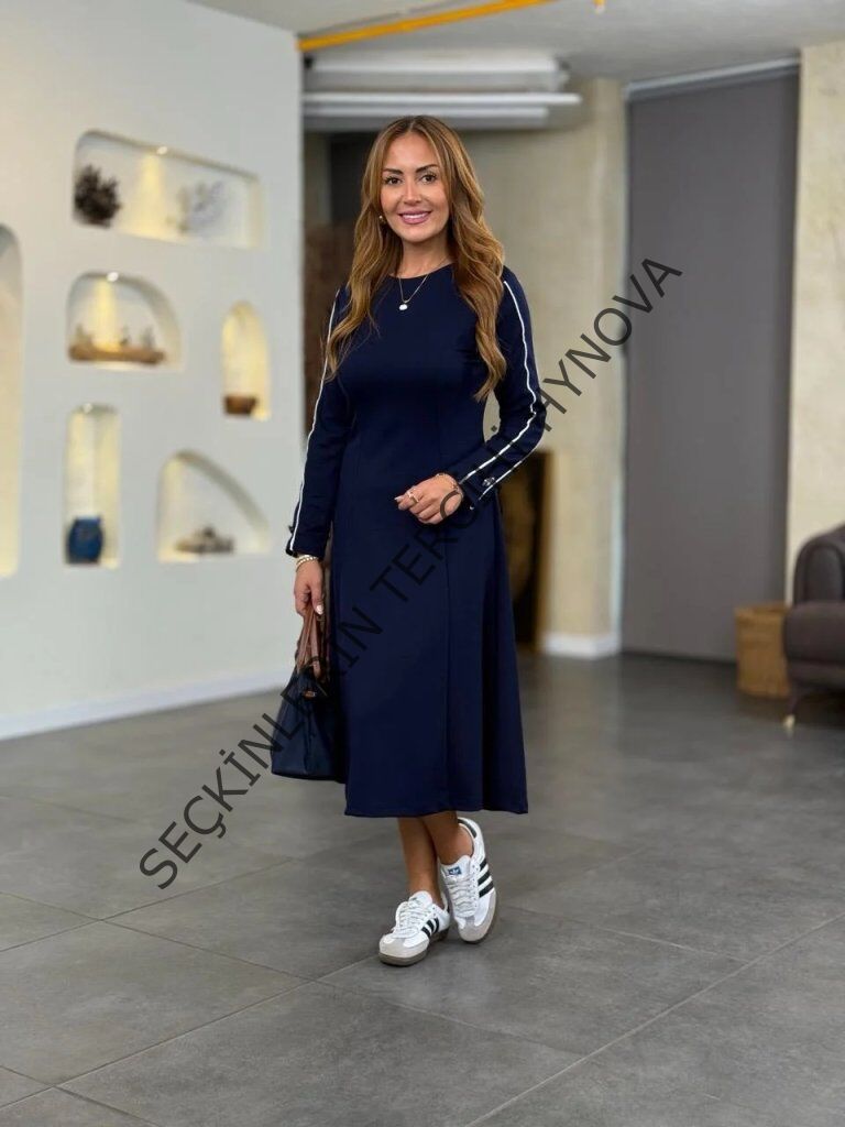 Kadın Uzun Kollu Bisiklet Yaka Midi Modal Elbise