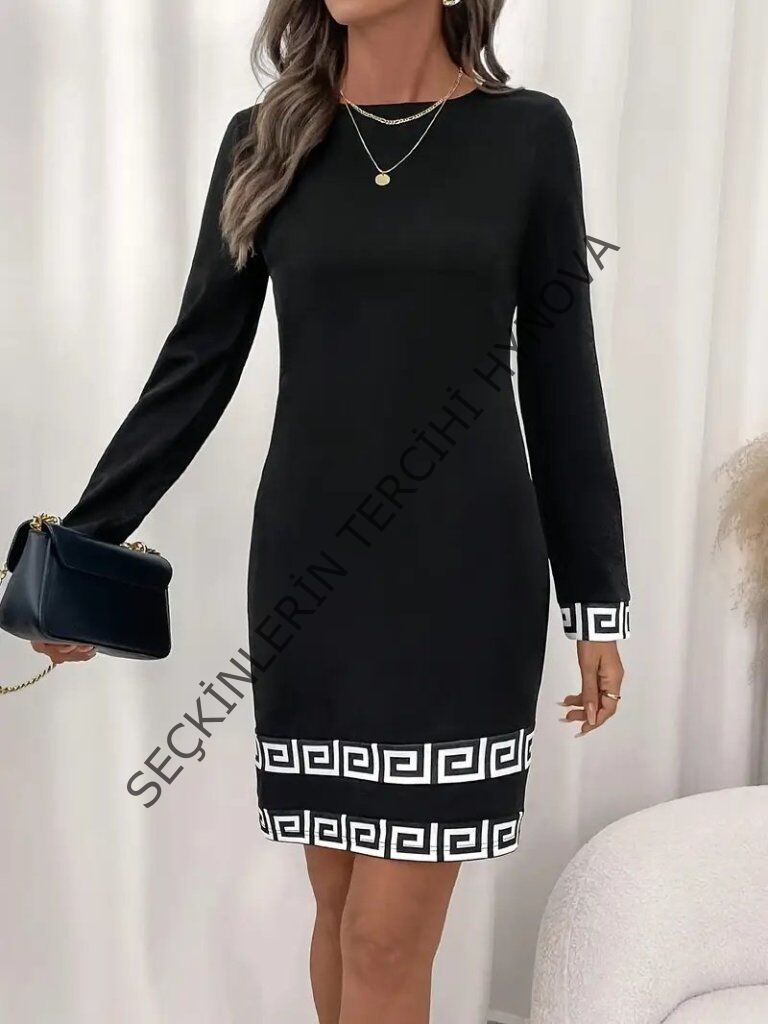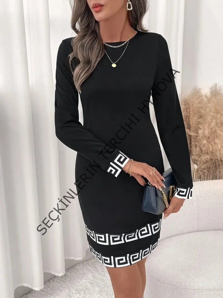 Kadın Uzun Kollu Bisiklet Yaka Mini Ithal Krep Elbise