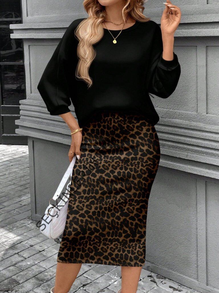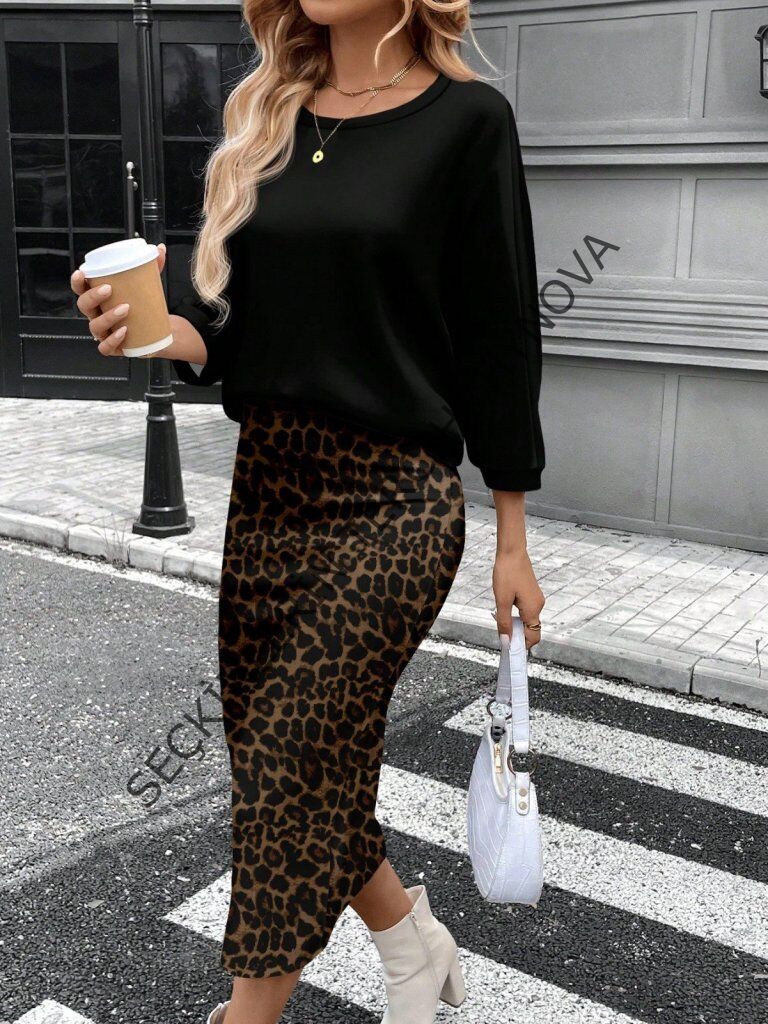Kadın Uzun Kollu Bisiklet Yaka Modal Bluz Ve Leopar Desenli Etek Ikili Takım