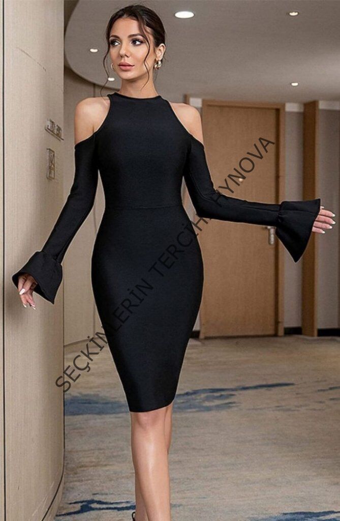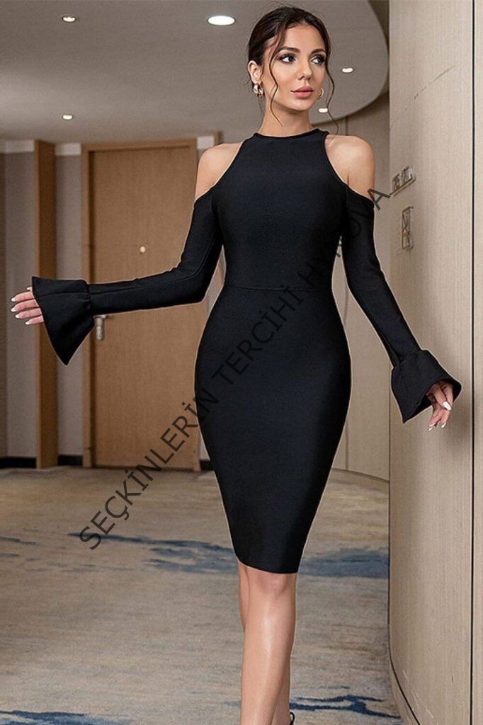Kadın Uzun Kollu Bisiklet Yaka Omuz Açık Kol Ağzı Fırfır Detay Dalgıç Midi Boy Elbise