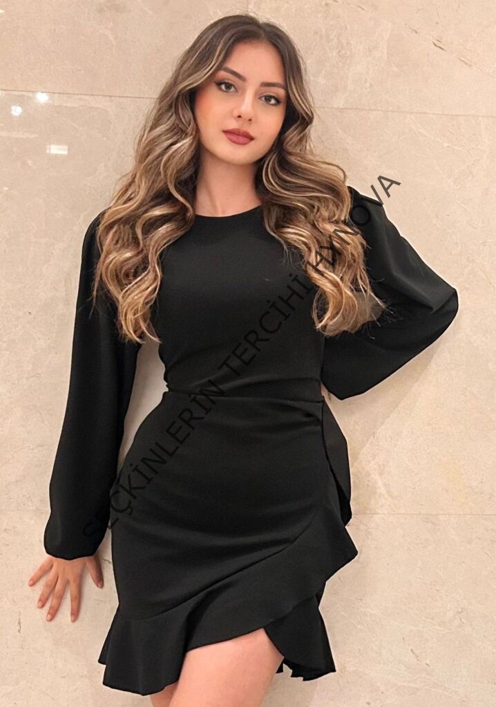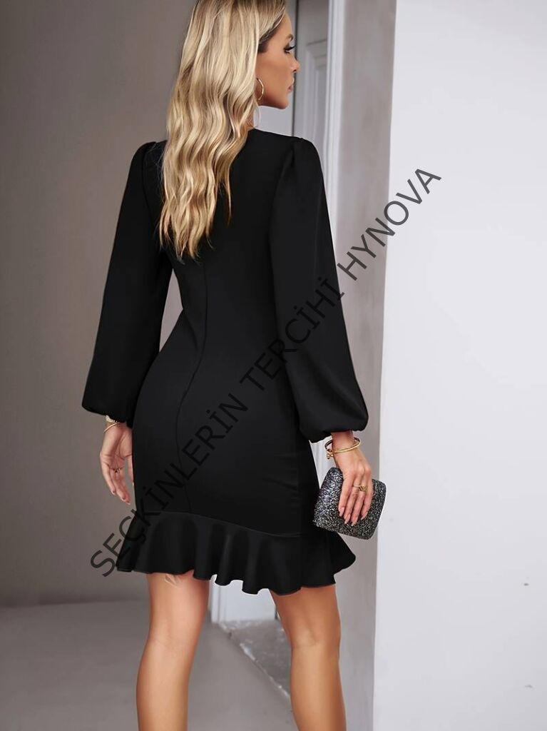 Kadın Uzun Kollu Bisiklet Yaka önden Volanlı Ithal Krep Elbise