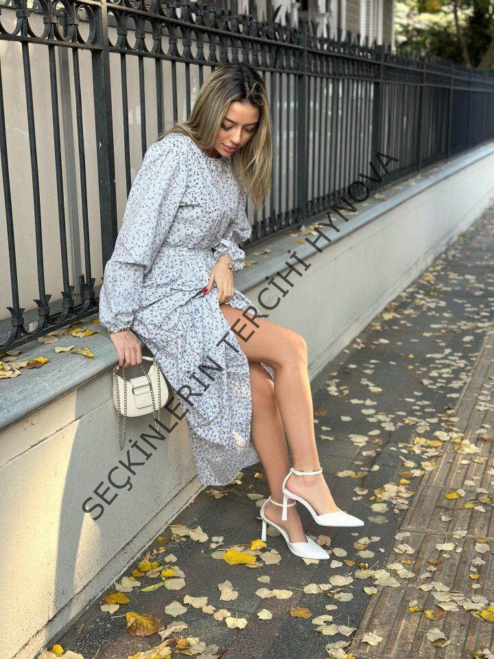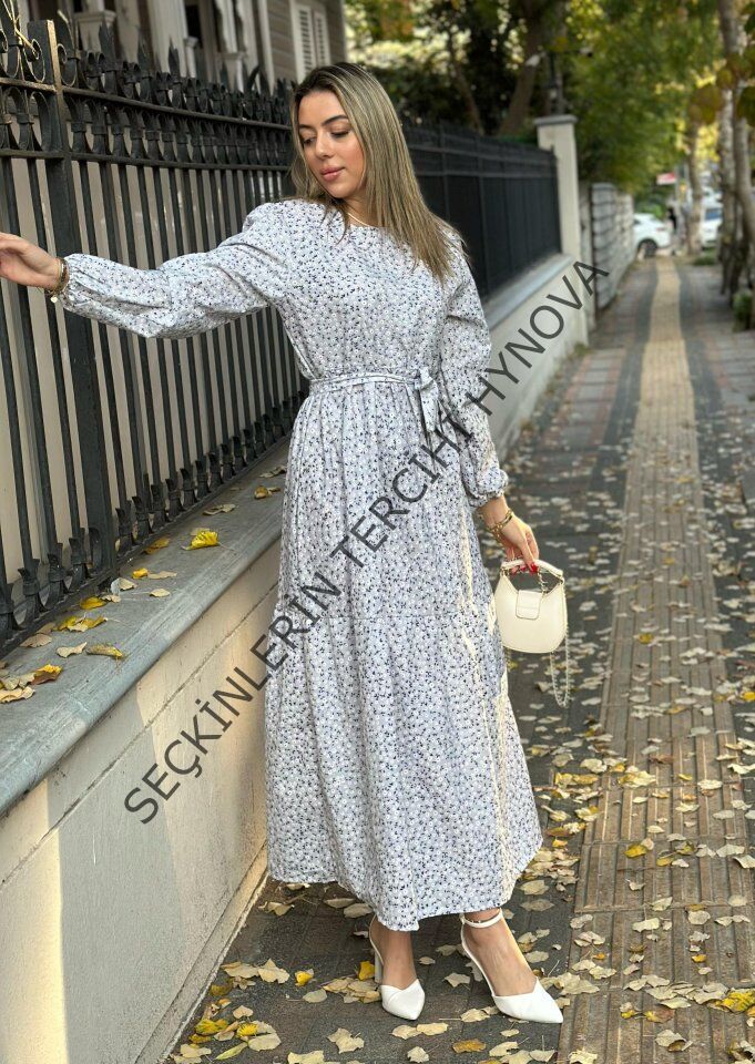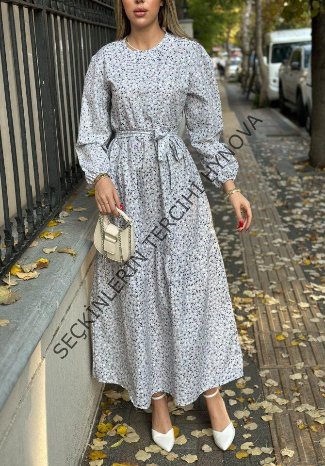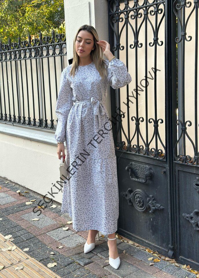 Kadın Uzun Kollu Bisiklet Yaka Papatya Desen Kuşak Dahil Maxi Boy Elbise