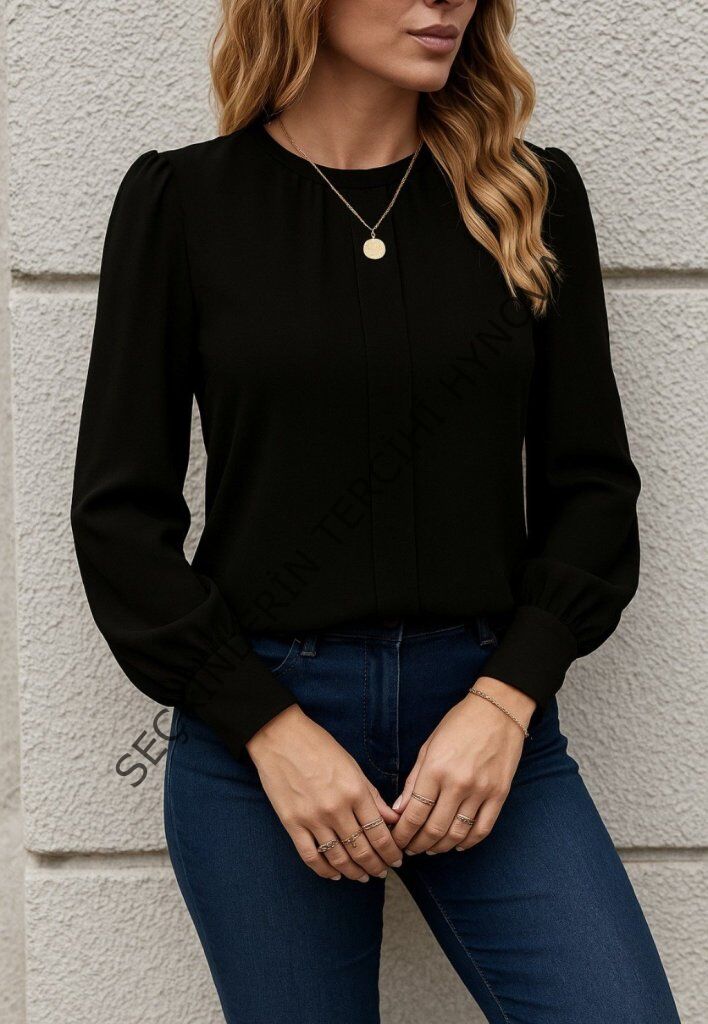 Kadın Uzun Kollu Bisiklet Yaka Pileli Ithal Krep Bluz