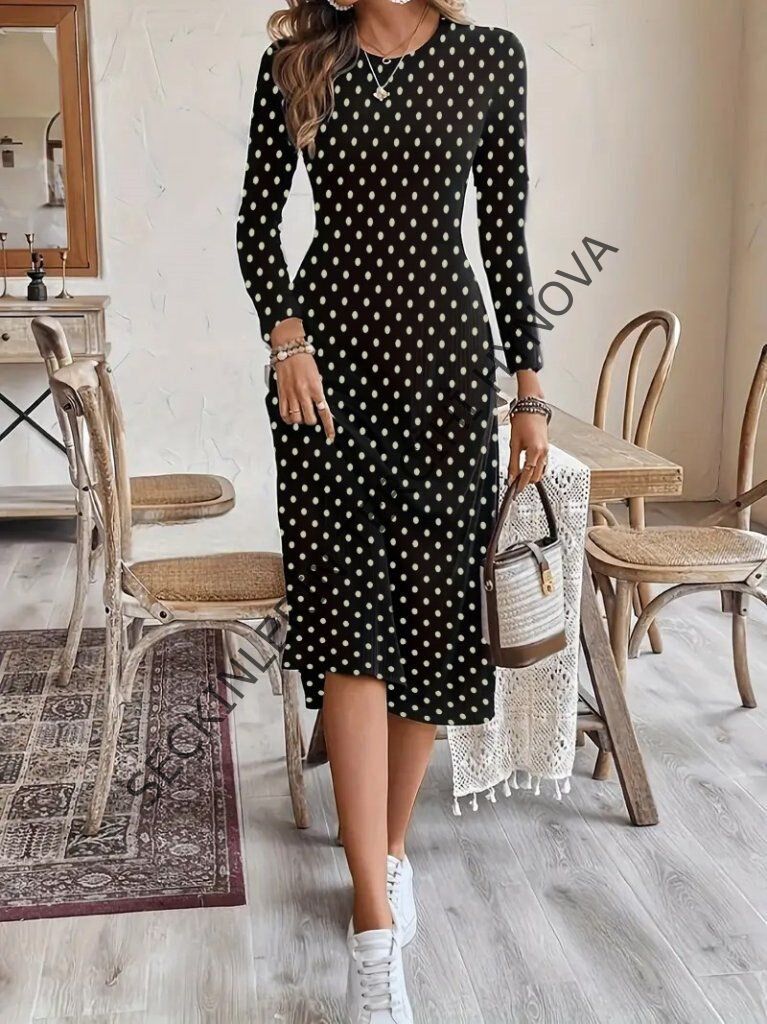 Kadın Uzun Kollu Bisiklet Yaka Puantiyeli örme Krep Midi Elbise