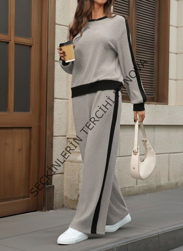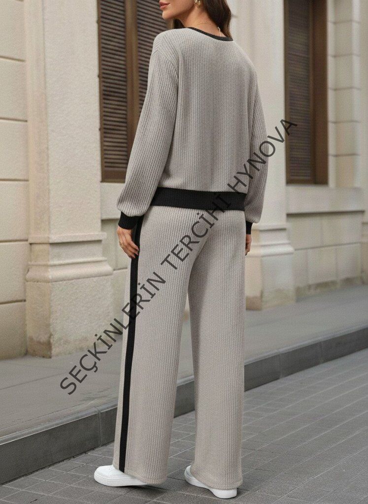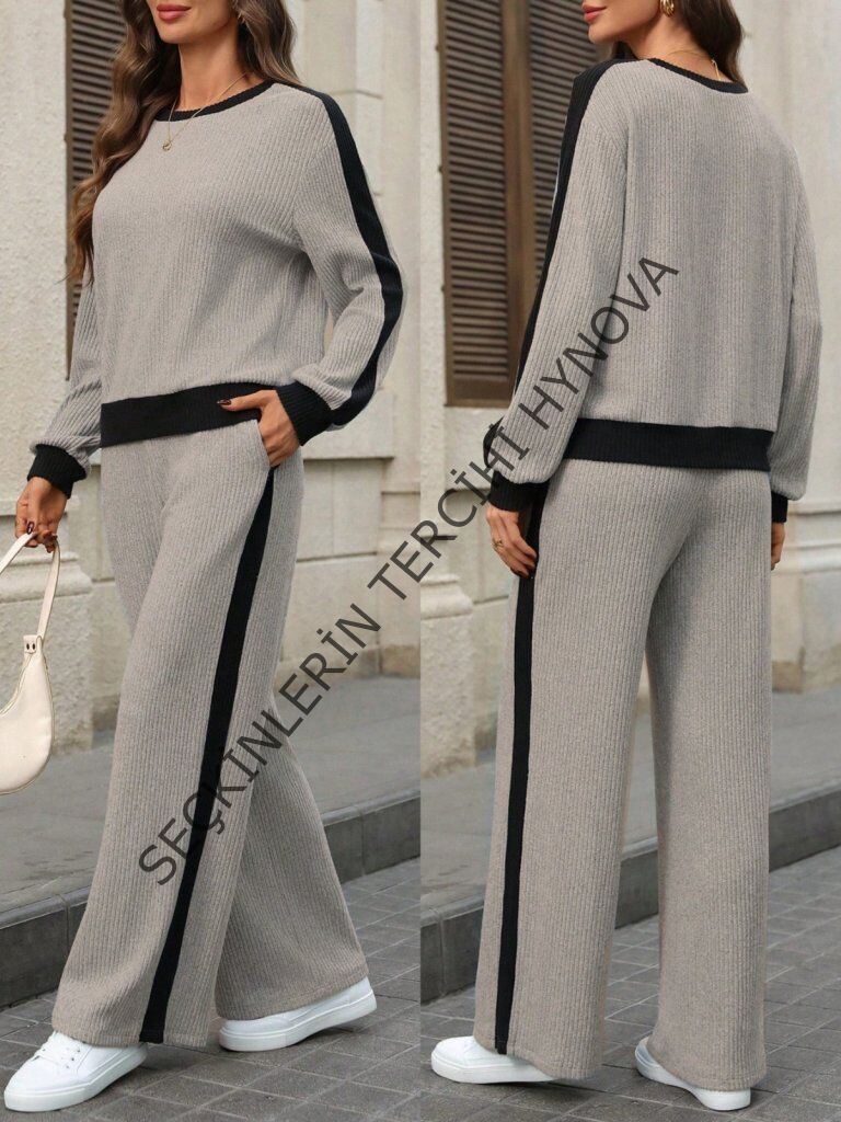 Kadın Uzun Kollu Bisiklet Yaka şardonlu Kaşkorse Bluz Ve Pantolon Ikili Takım