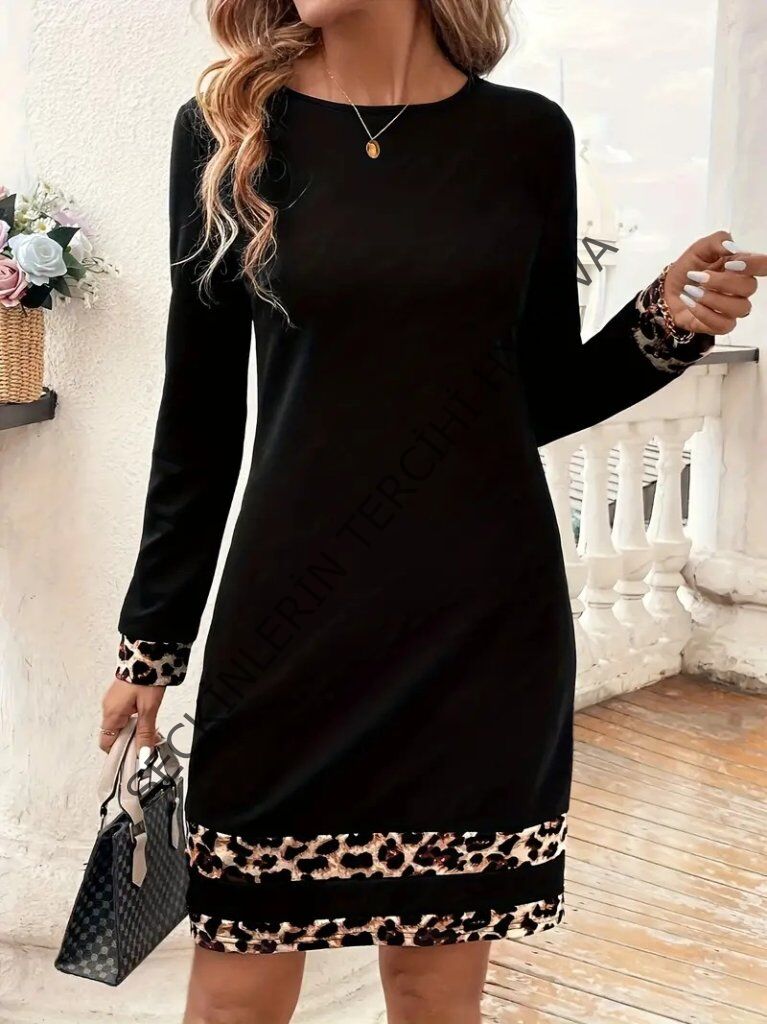 Kadın Uzun Kollu Bisiklet Yaka şerit Leopar Desenli Kısa Dalgıç Elbise