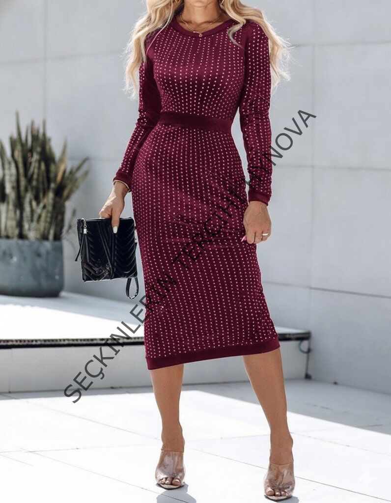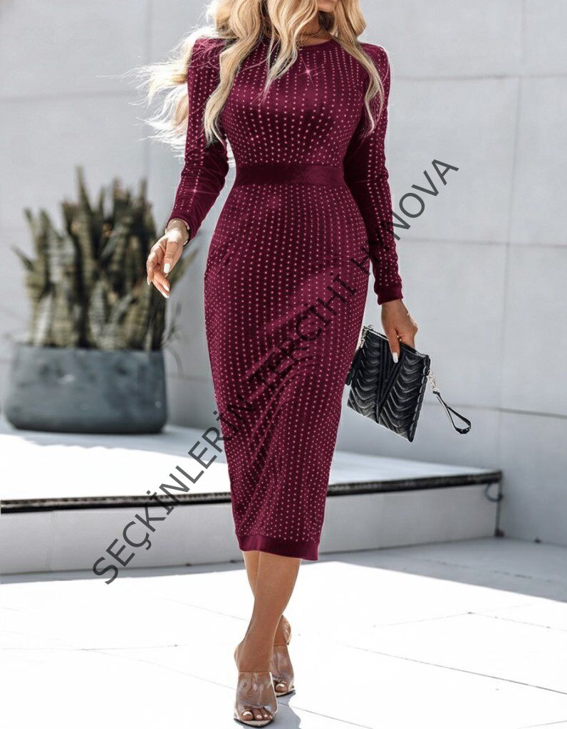 Kadın Uzun Kollu Bisiklet Yaka Taşlı Midi Kadife Elbise