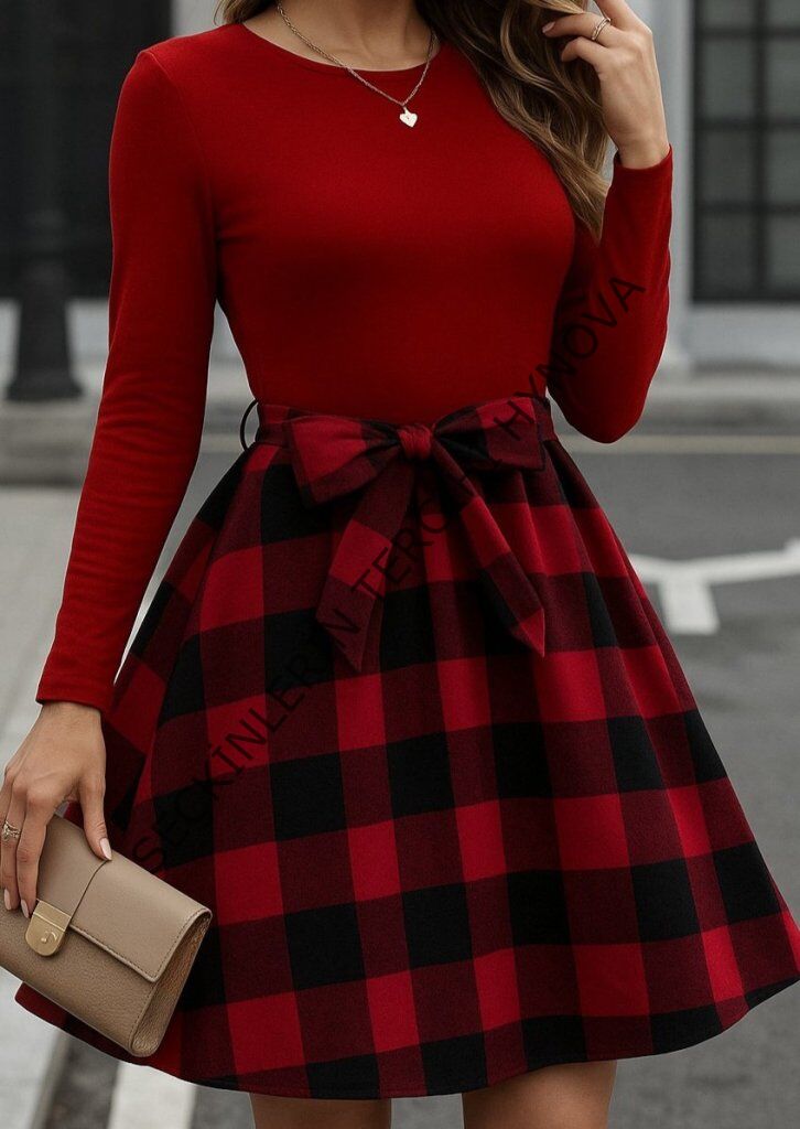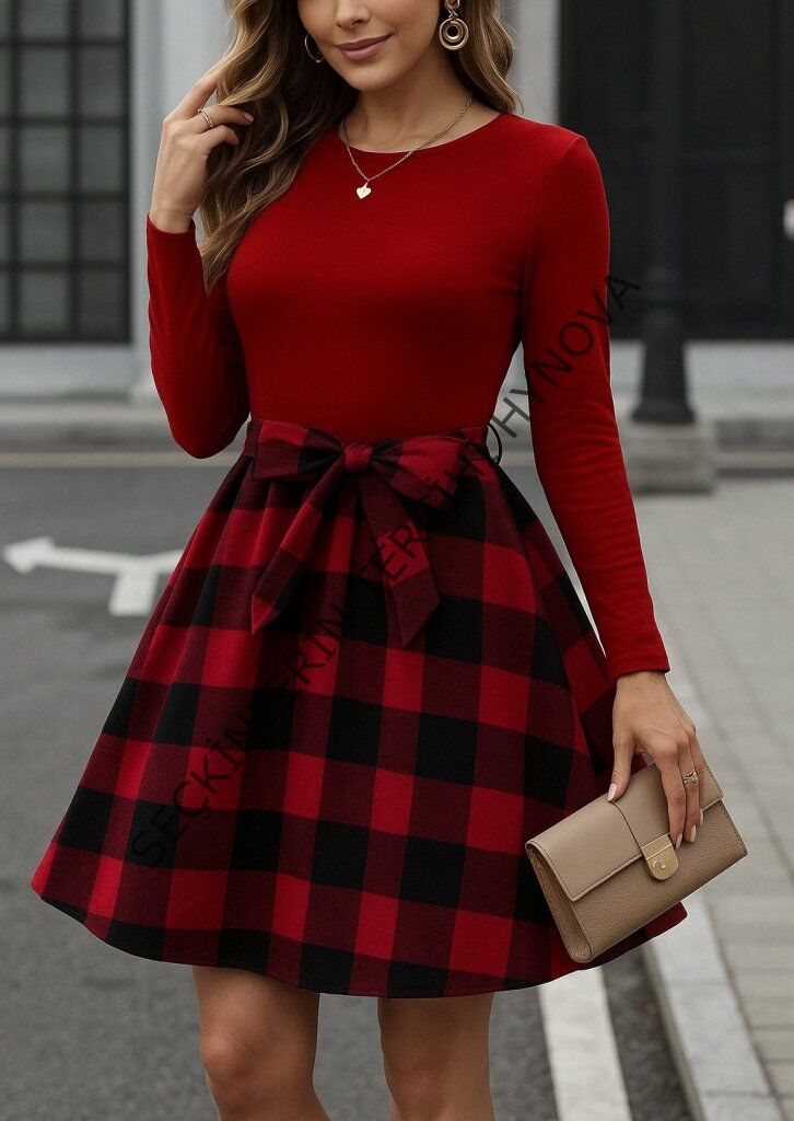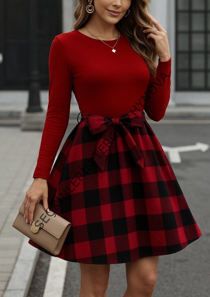 Kadın Uzun Kollu Bisiklet Yaka üst Viskon Alt Ekose Kısa Elbise