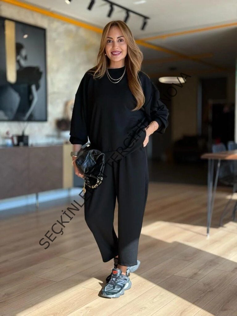 Kadın Uzun Kollu Bisiklet Yaka Viskon Iki Iplik Bluz Ve Pantolon Ikili Takım