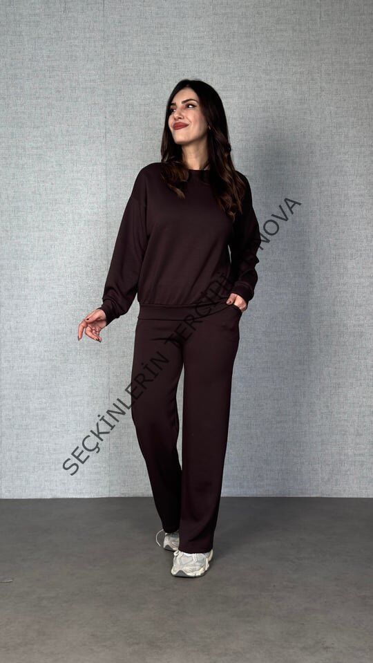 Kadın Uzun Kollu Bisiklet Yaka Viskon Iki Iplik Bluz Ve Pantolon Ikili Takım