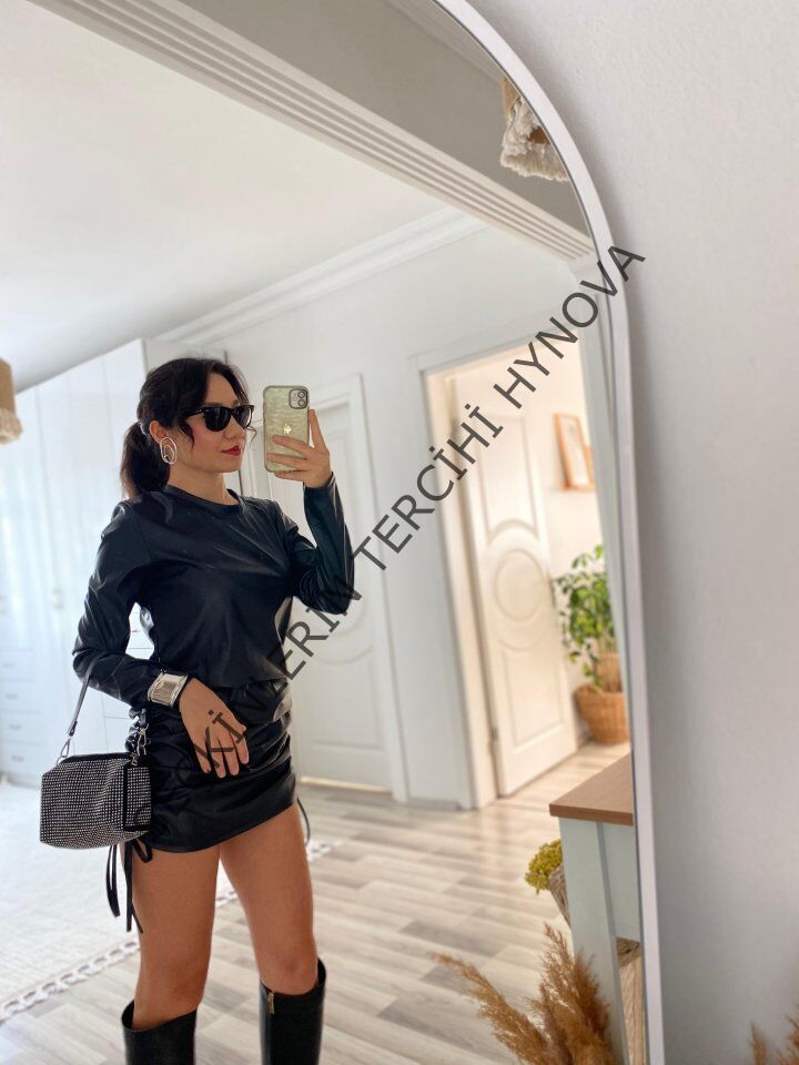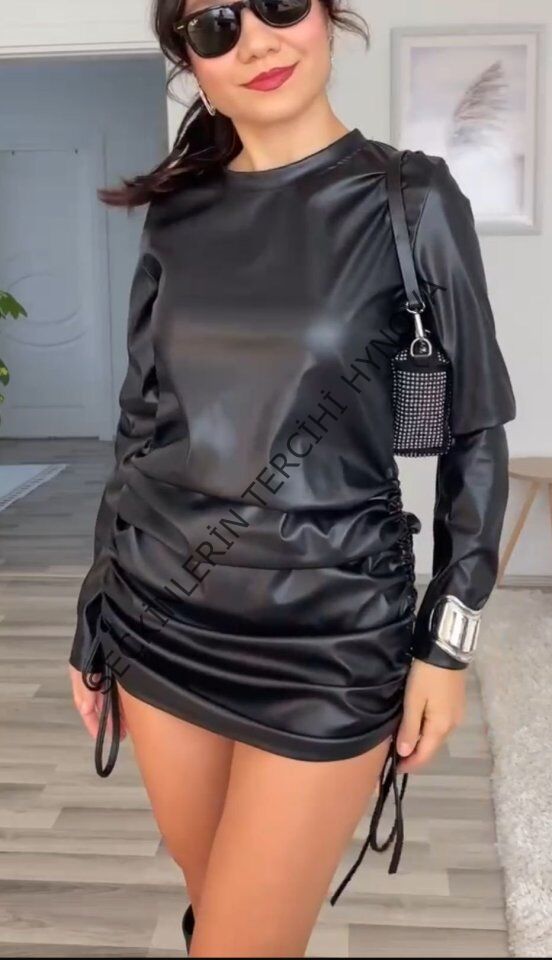 Kadın Uzun Kollu Bisiklet Yaka Yandan Büzgülü Kısa Deri Elbise