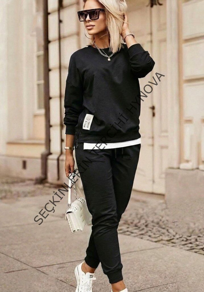 Kadın Uzun Kollu Bisiklet Yaka Yandan Fermuarlı Viskon Iki Iplik Bluz Ve Pantolon Ikili Takım