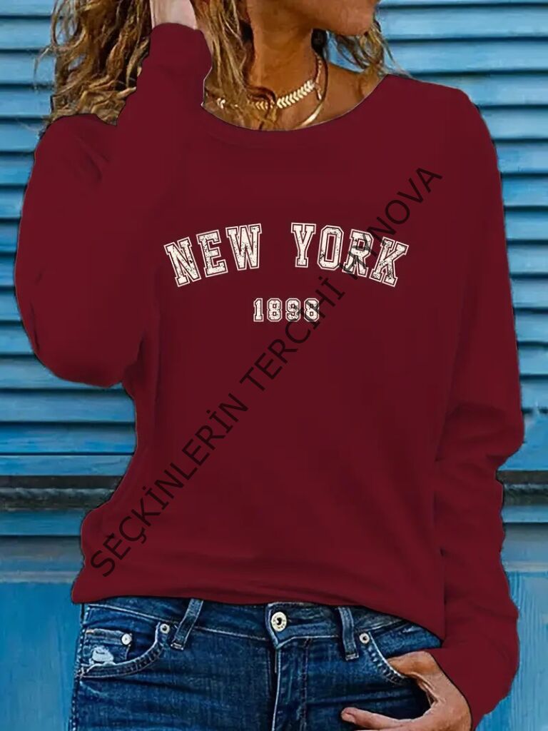 Kadın Uzun Kollu Bisiklet Yaka Yazı Baskılı Viskon Bluz