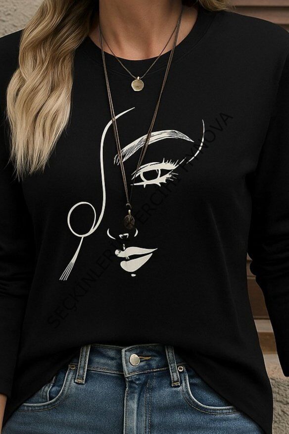 Kadın Uzun Kollu Bisiklet Yaka Yüz Desenli Viskon Bluz