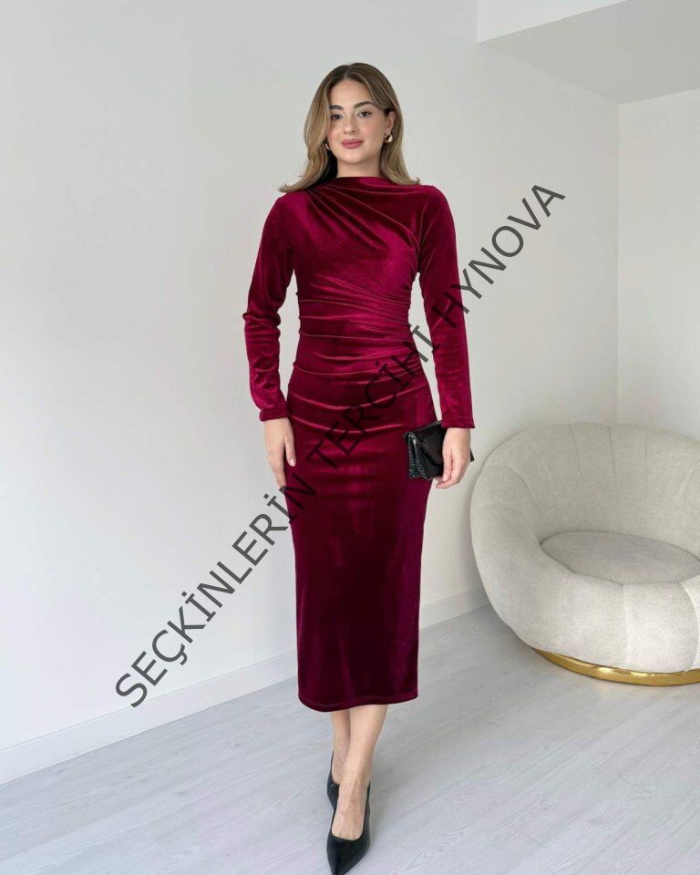 Kadın Uzun Kollu Büzgü Detay Kadife Kumaş Midi Boy Elbise