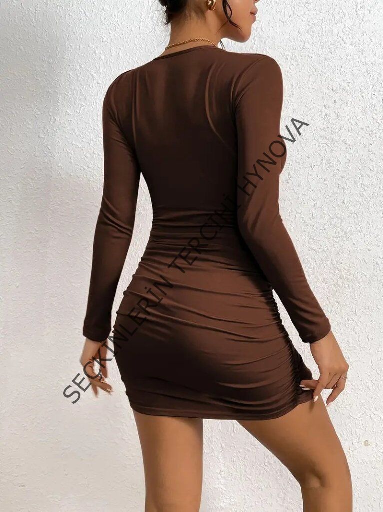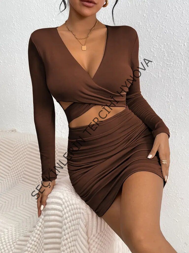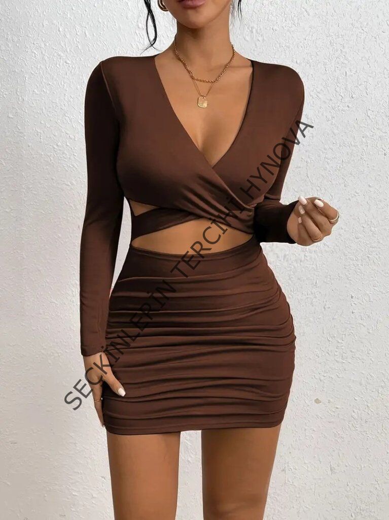 Kadın Uzun Kollu çapraz Dekolte Detaylı Mini Sandy Elbise