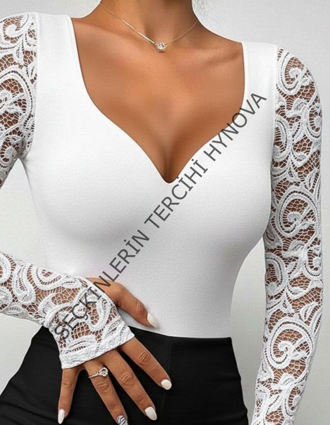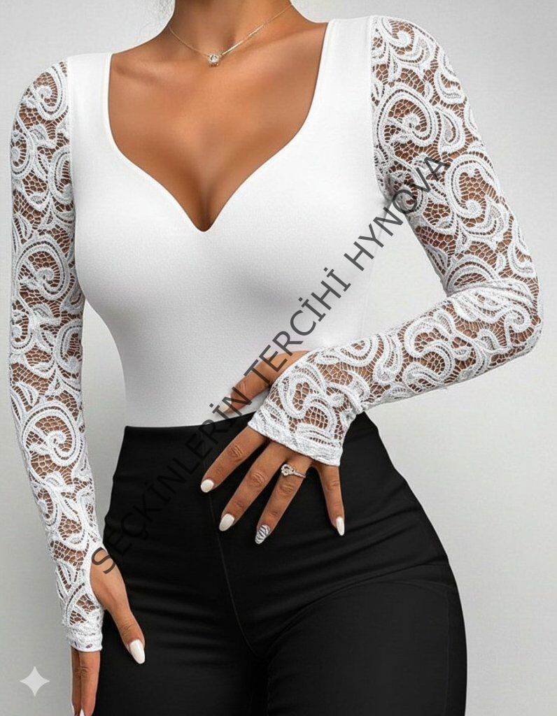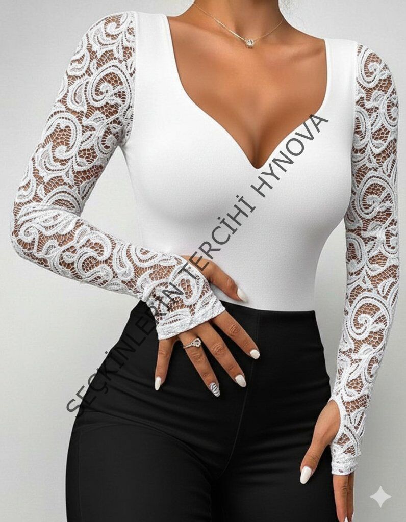 Kadın Uzun Kollu Dantelli Dekolte Detaylı Dalgıç Bluz