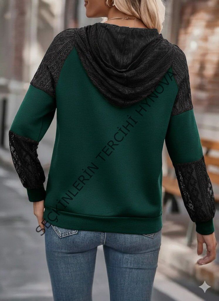 Kadın Uzun Kollu Dantelli Kapşonlu Viskon Iki Iplik Bluz