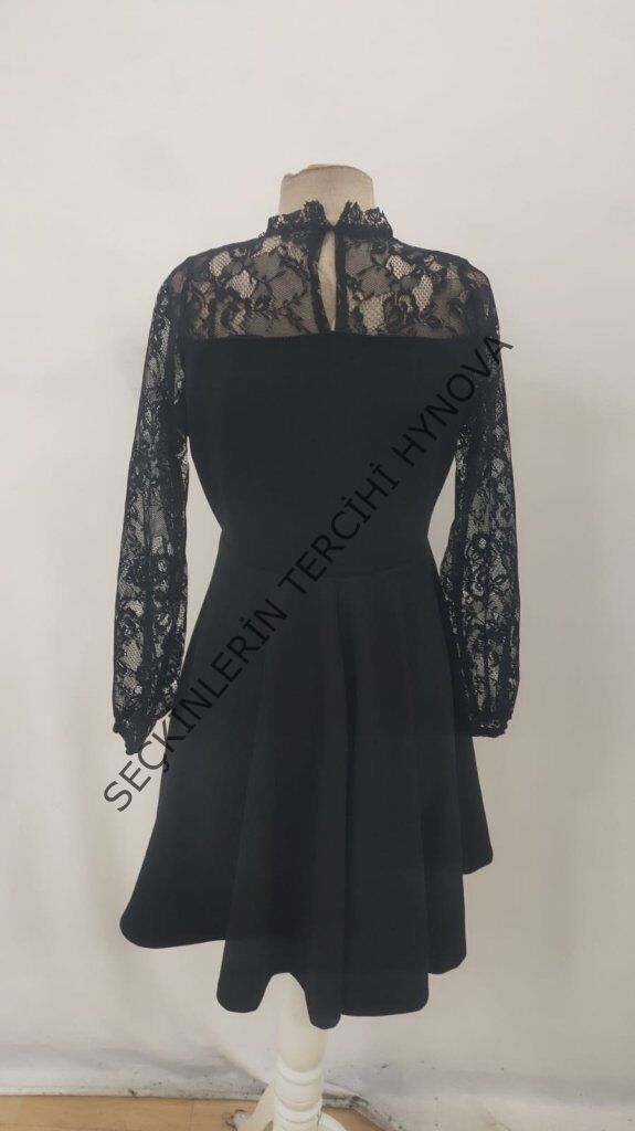 Kadın Uzun Kollu Dantelli Kloş Mini Ithal Krep Elbise