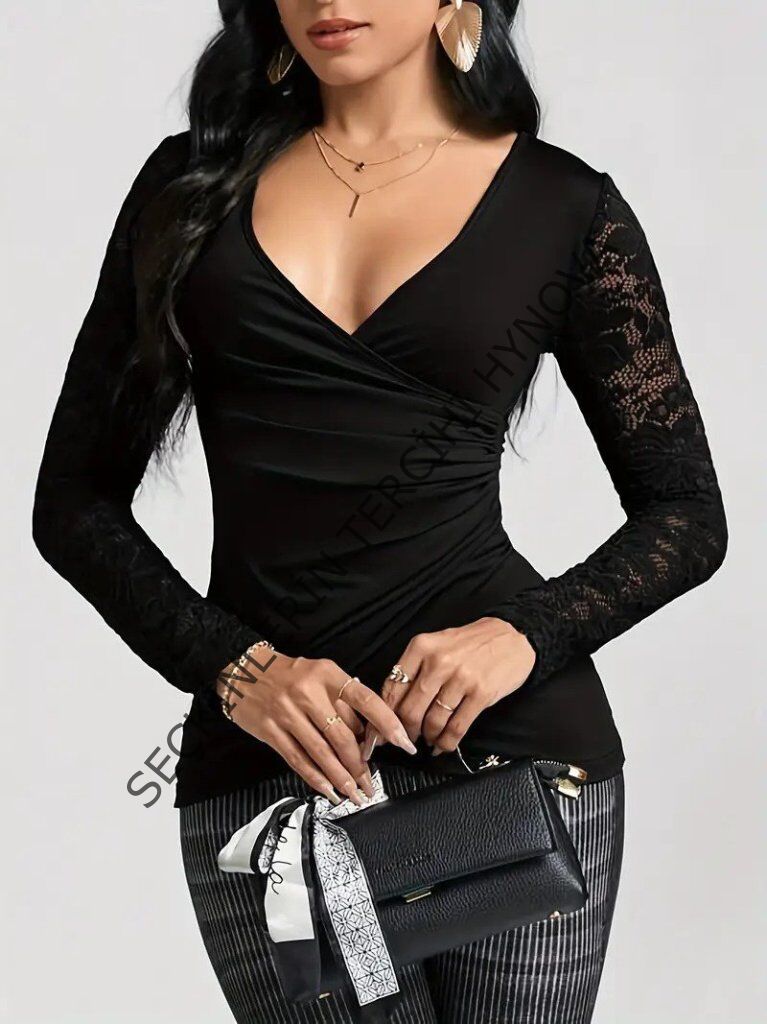 Kadın Uzun Kollu Dantelli Kruvaze Yakalı Yandan Büzgülü Viskon Bluz